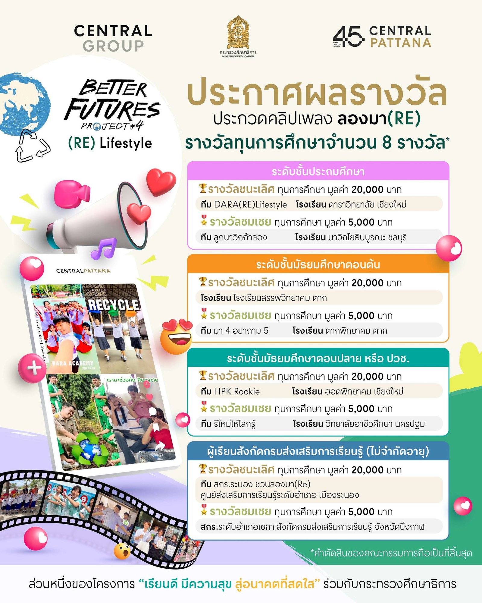 โครงการนี้เปิดโอกาสให้นักเรียนตั้งแต่ระดับประถมศึกษา มัธยมศึกษา ปวช. และผู้เรียนในสังกัดกรมส่งเสริมการเรียนรู้ ร่วมแสดงความคิดสร้างสรรค์ สวมบทบาทตามเนื้อหาในบทเพลง เต้น รวมถึงร้องเพลง ถ่ายทอดเนื้อหาที่เกี่ยวข้องกับการอนุรักษ์สิ่งแวดล้อมและการส่งเสริมชุมชน ซึ่งสอดคล้องกับแนวคิดในบทเพลง ‘ลองมา(RE)’ ลงในวิดีโอคลิปความยาวระหว่าง 1 ถึง 2 นาที ที่ออกแบบให้เหมาะสมสำหรับการเผยแพร่บน TikTok หรือ Facebook โดยผู้ชนะจากทีมต่างๆ พร้อมทั้งคณะครูอาจารย์และผู้ปกครอง ได้เข้าร่วมในพิธีรับประกาศนียบัตร ทุนการศึกษา และ ของที่ระลึกรวมมูลค่า 100,000 บาท จากตัวแทนศึกษาธิการจังหวัดฯ ผู้บริหารระดับสูงของเซ็นทรัลพัฒนา และ ผู้จัดการทั่วไปของศูนย์การค้าเซ็นทรัล 7 สาขา ทั่วประเทศ ได้แก่ ศูนย์การค้าเซ็นทรัล เชียงใหม่ ,เซ็นทรัล พิษณุโลก, เซ็นทรัล อุดร, เซ็นทรัล นครปฐม, เซ็นทรัล นครสวรรค์เซ็นทรัล ชลบุรี และ เซ็นทรัล สุราษฎร์ธานี โดยผลการตัดสิน จากคณะกรรมการ มีรายละเอียดดังนี้