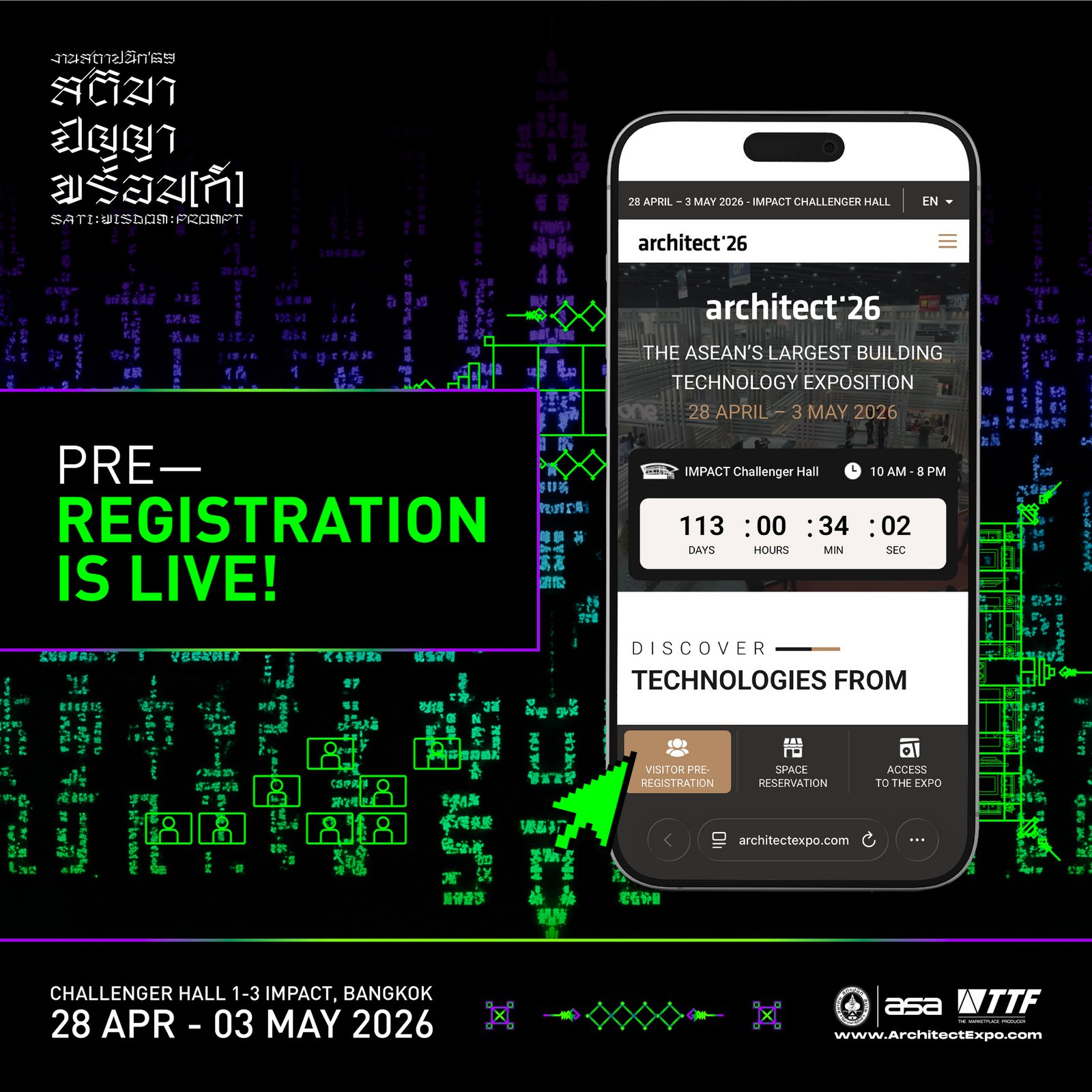สมาคมสถาปนิกสยาม ในพระบรมราชูปถัมภ์ ร่วมกับ บริษัท ทีทีเอฟ อินเตอร์เนชั่นแนล จำกัด เปิดให้ลงทะเบียนล่วงหน้า (Pre-registration) เข้าร่วมงาน สถาปนิก’69 งานแสดงเทคโนโลยีสถาปัตยกรรมและผลิตภัณฑ์ก่อสร้างที่ใหญ่ที่สุดและทรงอิทธิพลที่สุดในอาเซียน ครั้งที่ 38 ซึ่งมีกำหนดจัดขึ้นระหว่างวันที่ 28 เมษายน – 3 พฤษภาคม 2569 ณ อาคารชาเลนเจอร์ อิมแพ็ค เมืองทองธานี