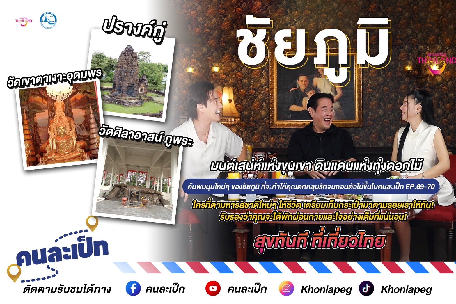 คนละเป็ก EP 69-70 มาค้นพบมุมใหม่ๆ ของจังหวัดชัยภูมิ ที่จะทำให้คุณตกหลมรักจนถอนตัวไม่ขึ้น เราขอแนะนำจังหวัดเล็กๆ ที่เต็มไปด้วยความยิ่งใหญ่ของธรรมชาติและศรัทธา ภูเขาเขียวขจี ป่าไม้ที่ยังคงความสมบูรณ์ อากาศบริสุทธิ์ที่ช่วยให้หัวใจได้พัก ใครที่ตามหารสชาติใหม่ๆ ให้ชีวิต เครียมเก็บกระเป๋ามาตามรอยเราให้ทัน!! รับรองว่าคุณจะได้พักผ่อนกายและใจอย่างเต็มที่แน่นอน