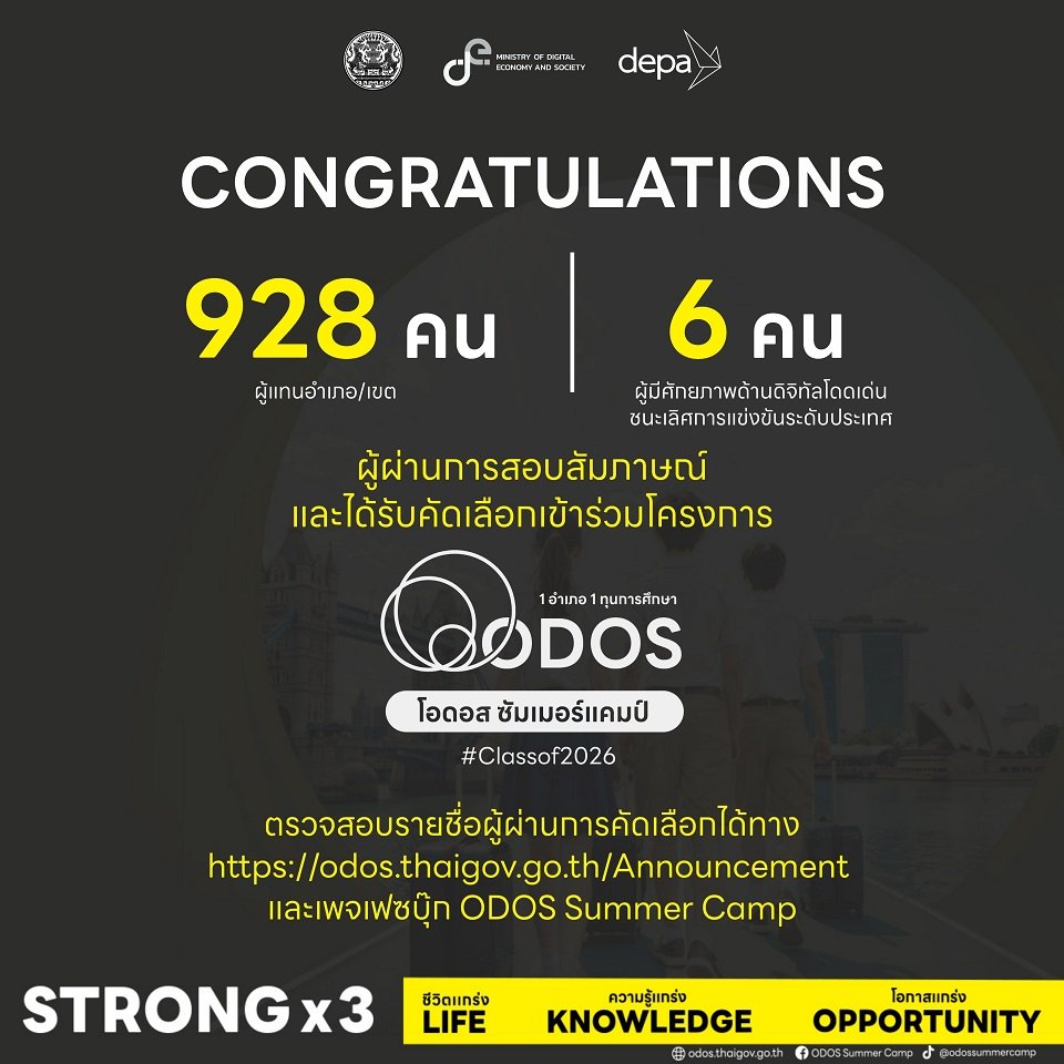 “ดีป้าขอแสดงความยินดีกับเยาวชนไทยทุกคนที่ผ่านการคัดเลือกในรอบสุดท้ายทั้งนี้ในกิจกรรม ODOS Summer Camp Selection Day #Classof2026 มีเยาวชนที่มีสิทธิ์จับสลากเลือกหลักสูตร/ประเทศและสอบสัมภาษณ์ฯทั้งสิ้น 928 คนโดยในจำนวนนี้มีผู้สละสิทธิ์ไม่มาเข้าร่วมกิจกรรมจำนวน 7 คนสำหรับการสอบสัมภาษณ์มีผู้แทนหลักสูตรและผู้แทนจากสถานทูตเป็นกรรมการสอบสัมภาษณ์โดยมีเยาวชนที่ผ่านการสอบสัมภาษณ์จำนวน 888 คนไม่ผ่านการสอบสัมภาษณ์จำนวน 33 คนเนื่องจากไม่เป็นไปตามเกณฑ์เรื่องทักษะการสื่อสารด้วยภาษาอังกฤษและเกณฑ์อื่นๆตามที่คณะกรรมการกำหนดทั้งนี้คณะกรรมการได้คัดเลือกผู้สมัครรายชื่อสำรองซึ่งเป็นผู้ที่มีคะแนนในลำดับถัดไปของอำเภอ/เขตหรือจังหวัดเพื่อเข้าสู่กระบวนการคัดเลือกและจับสลากแทนผู้ที่สละสิทธิ์/สอบไม่ผ่านจำนวน 40 คนและได้ผู้แทนอำเภอ/เขตครบถ้วน 928 คนแล้ว” ผู้อำนวยการใหญ่ ดีป้า กล่าว