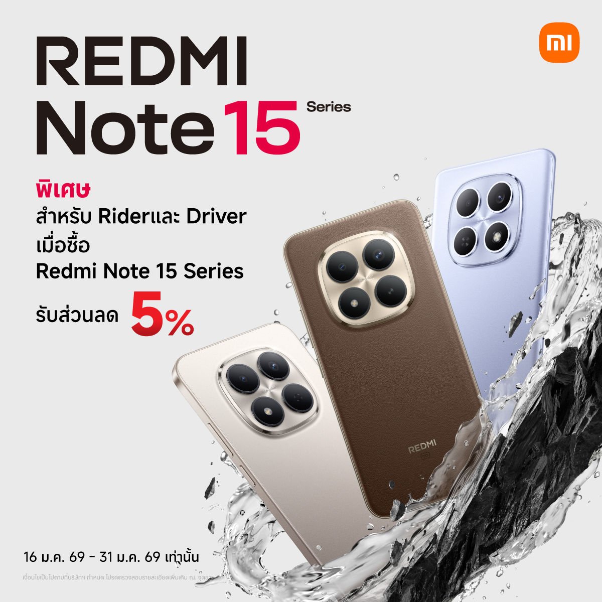 เสียวหมี่ ประเทศไทย ขอส่งต่อความแข็งแกร่งระดับไททัน แก่ผู้ให้บริการ Grab / LINE MAN / Bolt (Rider & Driver) ทุกท่านในการทำหน้าที่ส่งต่อความสุขในทุกสภาวะอากาศและสถานการณ์ด้วย REDMI Note 15 Series ที่มาพร้อมความทนทานต่อแรงกระแทกถึง 2.5 เมตร ผ่านการรับรองกันน้ำ 24 ชม. ที่ความลึก 2 เมตร โดยมอบส่วนลดทันที 5%1 เมื่อซื้อ REDMI Note 15 Series ทุกรุ่นตั้งแต่วันนี้ – 31 มกราคม 2569 ที่ Xiaomi Store หรือที่เว็บไซต์ www.mi.com/th15 เพียงกดรับโค้ดส่วนลดในแอปพลิเคชันของผู้ให้บริการของตนเอง แล้วมาแสดงหน้าร้านหรือกรอกลงในเว็บไซต์ก่อนขั้นตอนการชำระเงิน