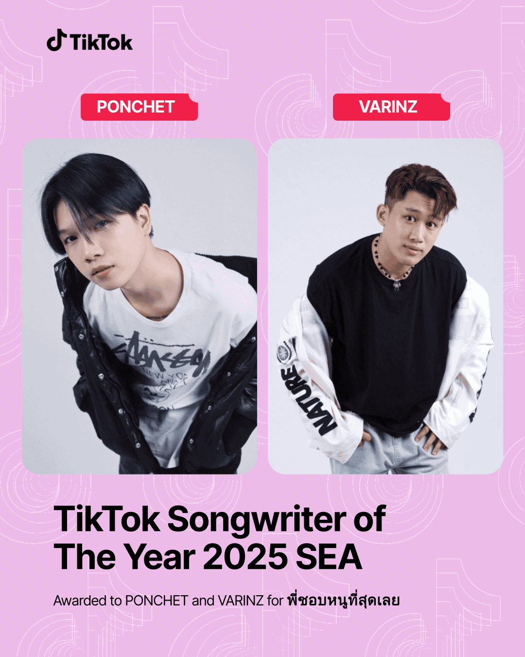 เป็นความภูมิใจของวงการเพลงไทยอีกครั้ง! ล่าสุด TikTok ประกาศมอบรางวัลใหญ่ระดับภูมิภาค “Southeast Asia TikTok Songwriters of the Year 2025” ให้กับสองหนุ่มศิลปินไทยมากฝีมือ PONCHET (เชษฐกิตติ์ ทุนมาก) และ VARINZ (วรินทร วงษ์คลองเขื่อน) ผู้อยู่เบื้องหลังเพลงสุดฮิตระดับปรากฏการณ์อย่าง “พี่ชอบหนูที่สุดเลย (Speed Up)” ที่ดังไกลไปทั่วภูมิภาคเอเชียตะวันออกเฉียงใต้ และถูกนำไปใช้เป็นเพลงประกอบคลิปวิดีโอบนแพลตฟอร์ม TikTok อย่างถล่มทลายกว่า 97.8 ล้านคลิป