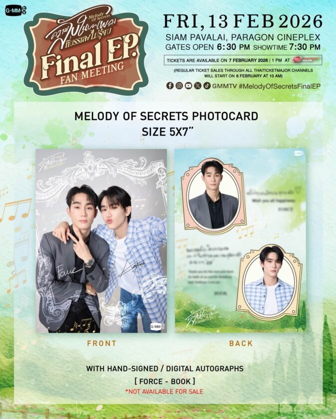 แฟนๆ เตรียมลุ้นระทึกโค้งสุดท้ายกับบทสรุปตอนจบซีรีส์“ความลับในบทเพลงที่บรรเลงไม่รู้จบ Melody of Secrets” จาก “GMMTV” คอนเทนต์โพรไวเดอร์ชั้นนำของเมืองไทย เรื่องราวความรักที่ซับซ้อนซ่อนปมปริศนาไว้มากมาย ของสองนักแสดง สุดปัง“ฟอส–จิรัชพงศ์ ศรีแสง” และ “บุ๊ค–กษิดิ์เดช ปลูกผล” ที่พวกเขาทั้งคู่จะพาแฟนๆ ไปร่วมสืบหาความลับของบทเพลง กันครั้งสุดท้ายบนจอภาพยนตร์ และร่วมรับชมตอนจบซีรีส์พร้อมกับทีมนักแสดงสุดฮอต “บุ๋น–นพณัฐ กันทะชัย, แจน–พลอยชมพูศุภทรัพย์, พลอยภัช– ภัชธร ธนวัฒน์” และผู้กำกับฯ คนเก่ง “ตะวัน จารุจินดา, อริษา แวววรรณจิตร” พร้อมเตรียมฟินไปกับ Special Show สุด Exclusive จากเหล่านักแสดง รวมถึงโมเมนต์สุดคิ้วท์ในช่วงการสัมภาษณ์พิเศษ และพูดคุยถึงเบื้องลึกเบื้องหลังซีรีส์สุดอบอุ่นกับงาน “ความลับในบทเพลงที่บรรเลงไม่รู้จบ Final EP. FAN MEETING” ในวันศุกร์ที่13 กุมภาพันธ์2569 ตั้งแต่เวลา19.30 น. ณ ชั้น6 สยามพารากอน– โรงภาพยนตร์สยามภาวลัย Paragon Cineplex ที่แฟนๆ ต้องไม่พลาด เพราะรับรองว่างานนี้ทั้งลุ้นทิ้งฟินไม่หยุดแน่นอน