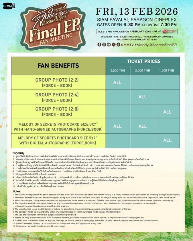 สำหรับผู้ที่สนใจสามารถจับจองบัตรเข้าร่วมงาน “ความลับในบทเพลงที่บรรเลงไม่รู้จบ Final EP. FAN MEETING” โดยเปิดจำหน่ายบัตร บนช่องทาง Online ในวันเสาร์ที่ 7 กุมภาพันธ์นี้เวลา 13.00 น. เป็นต้นไปและเปิดจำหน่ายบัตรทุกช่องทางตามปกติในวันอาทิตย์ที่ 8 กุมภาพันธ์ 2569 เวลา 10.00 น. เป็นต้นไปบัตรราคา 2,500 / 2,000 / 1,500 บาททางไทยทิคเก็ตเมเจอร์ทุกสาขา, www.thaiticketmajor.com และ Call Center โทร 0-2262-3456 ติดตามรายละเอียดเพิ่มเติมได้ที่เว็บไซต์ : www.thaiticketmajor.com Facebook : www.facebook.com/gmmtvofficialและ Instagram & X & TikTok & YouTube & Weibo : GMMTV