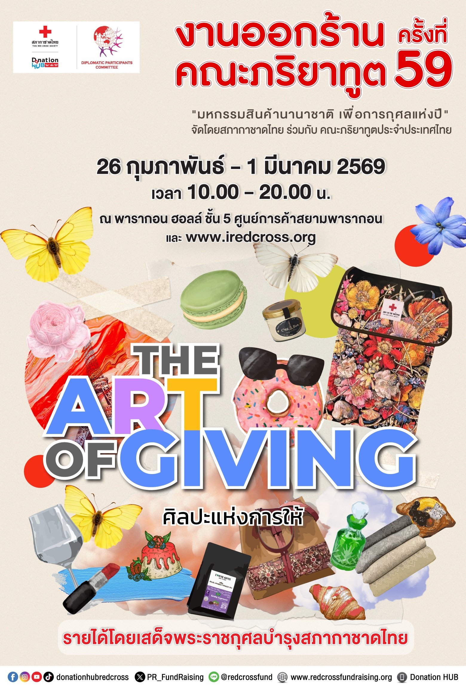 สำหรับ งานออกร้านคณะภริยาทูตครั้งที่59 จัดขึ้นภายใต้แนวคิด “THE ART OF GIVING ศิลปะ แห่งการให้” ระหว่างวันที่26 กุมภาพันธ์ถึง1 มีนาคม2569 เวลา10.00–20.00 น. ณพารากอนฮอลล์ชั้น5 ศูนย์การค้าสยามพารากอนและทางเว็บไซต์ www.iredcross.org โดยได้รับความร่วมมือจากสถานทูตกว่า 50 ประเทศ ร่วมออกร้านจำหน่ายสินค้า ผลิตภัณฑ์พื้นเมือง อาหาร สินค้าอุปโภคบริโภค เสื้อผ้า เครื่องประดับ และของตกแต่งบ้าน สะท้อนเอกลักษณ์จากทั่วทุกมุมโลก อาทิ ผลิตภัณฑ์บำรุงผิวจากกุหลาบบัลแกเรีย เจลอาบน้ำและโลชั่นจากสเปน อาร์แกนออยล์บริสุทธิ์จากโมร็อกโก ผ้าแคชเมียร์ เครื่องหนังจากมองโกเลีย เครื่องแก้วจากสาธารณรัฐเช็ก ตลอดจนสินค้าพื้นเมืองจากปากีสถาน เนปาล ศรีลังกา เม็กซิโก มาเลเซีย อินโดนีเซีย จีน และสินค้าจากร้านโครงการในพระราชดำริฯ เป็นต้น