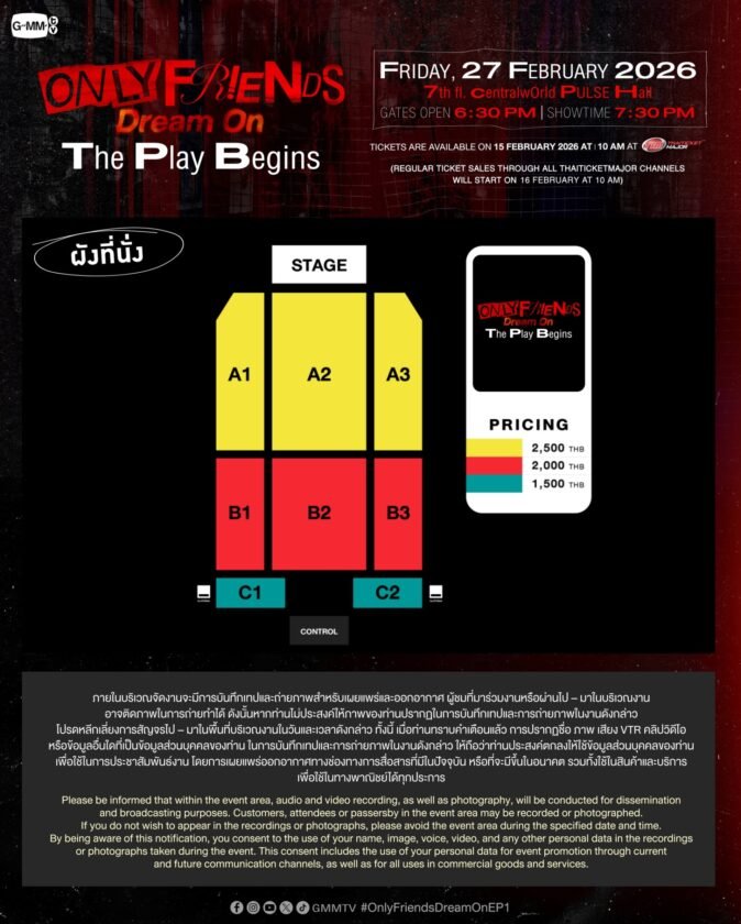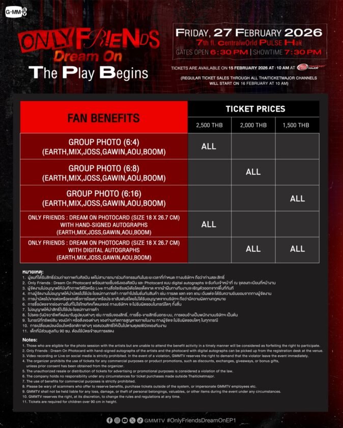 สำหรับผู้ที่สนใจสามารถจับจองบัตรเข้าร่วมงาน “Only Friends Dream On : The Play Begins” โดยเปิดจำหน่ายบัตรบนช่องทาง Online ในวันอาทิตย์ที่ 15 กุมภาพันธ์นี้เริ่มเวลา 10.00 น. เป็นต้นไปและทุกช่องทางตามปกติในวันจันทร์ที่ 16 กุมภาพันธ์นี้เริ่มเวลา 10.00 น. เป็นต้นไปบัตรราคา 2,500 / 2,000 / 1,500 บาทที่ไทยทิคเก็ตเมเจอร์ทุกสาขา, www.thaiticketmajor.com และ Call Center โทร 0-2262-3456 ติดตามรายละเอียดเพิ่มเติมได้ที่เว็บไซต์ : www.thaiticketmajor.com และ Facebook / Instagram / X / TikTok / YouTube / Weibo: GMMTV