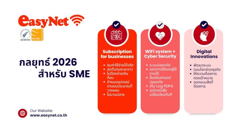 บริษัทอีซี่เน็ต (ไทยแลนด์) จำกัด ผู้เชี่ยวชาญการด้านวางระบบ Network และ ไอที โซลูชันเต็มรูปแบบอย่างครบวงจรโดยได้การรับรองจาก ISO9001 : 2015 และ ISO27001 นำโดย นายโกวิท ธารีรัตนาวิบูลย์ ประธานเจ้าหน้าที่บริหาร พร้อมด้วยนางวาณา ธารีรัตนาวิบูลย์ ประธานเจ้าหน้าที่ฝ่ายการตลาด และนายพงศภัค ธารีรัตนาวิบูลย์ ประธานเจ้าหน้าที่ฝ่ายปฏิบัติการ จัดงานแถลงข่าว “เปิดกลยุทธ์ EasyNet 2026: เพื่อนคู่คิดทางเทคโนโลยีของ SME” มุ่งเป้าขับเคลื่อนเศรษฐกิจดิจิทัลของไทยผ่านโมเดล “เช่าระบบ WiFi พร้อมอุปกรณ์แบบครบวงจร” (WiFi as a Service) เพื่อทลายขีดจำกัดด้านงบประมาณและเพิ่มขีดความสามารถในการแข่งขันให้กับผู้ประกอบการทุกระดับ