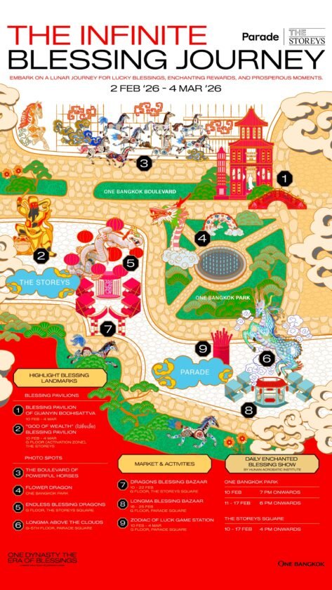 - ตลาดแห่งโชคลาภ (Dragons Blessing Bazaar) – สัมผัสวิถีแห่งความมงคลในบรรยากาศตรุษจีนสุดคึกคักในคอนเซปต์ “พรอันไม่มีที่สิ้นสุด” (Infinite Blessings) รวบรวมร้านค้าและกิจกรรมเพื่อเสริมสิริมงคลมากมาย ที่เดอะสตอรี่ส์สแควร์ ตั้งแต่วันที่ 10 – 22 กุมภาพันธ์ 2569
