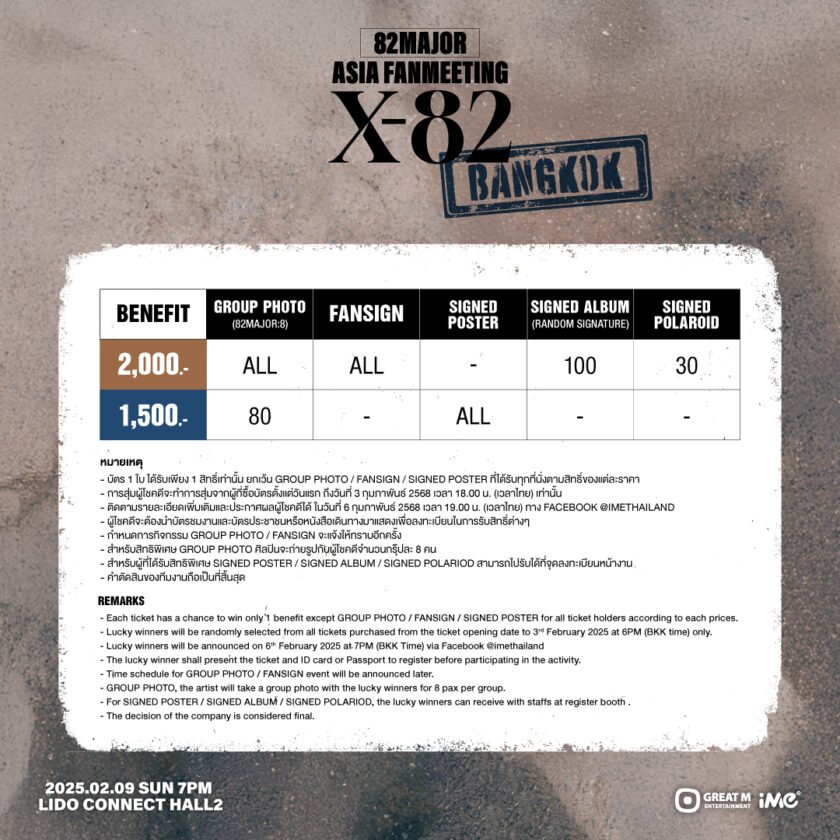 ย้ำอีกครั้ง! “82MAJOR”ดีใจ และตื่นเต้นสุดๆ ที่จะได้มามอบความสุขให้แฟนคลับที่เมืองไทยในงาน “2025 82MAJOR <X-82> ASIA FAN MEETING in BANGKOK” ซึ่งจะจัดขึ้นในวันอาทิตย์ที่ 9 กุมภาพันธ์ 2568 ณ LIDO CONNECT HALL2 แฟนๆ สามารถติดตามรายละเอียดเพิ่มเติมได้ที่ Facebook @imethailand, IG และ Twitter @ime_th