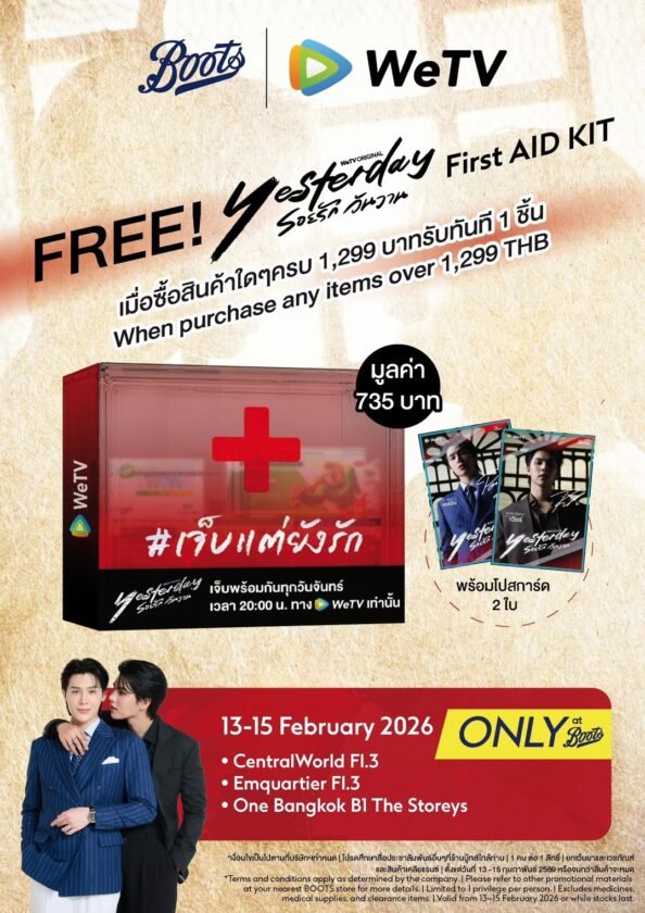 เล่นใหญ่สมกับเป็นแพลตฟอร์มวิดีโอสตรีมมิงที่รวมสุดยอดความบันเทิงคุณภาพแห่งเอเชีย เมื่อ WeTV จับมือ Boots ผู้นำด้านผลิตภัณฑ์เพื่อสุขภาพและความงามของประเทศไทย ผุดไอเดียเยียวยาใจแฟนซีรีส์สุดเจ็บแห่งปี WeTV Original “Yesterday รอยรักวันวาน” ผ่าน “First Aid Kit กล่องยารักษาแผลใจ” เพื่อเป็นการตอบรับกระแสหลังจากซีรีส์ออกอากาศ ที่ทำเอาแฟน ๆ ทั้งอินทั้งเจ็บไปพร้อมกันทั่วประเทศ