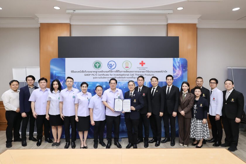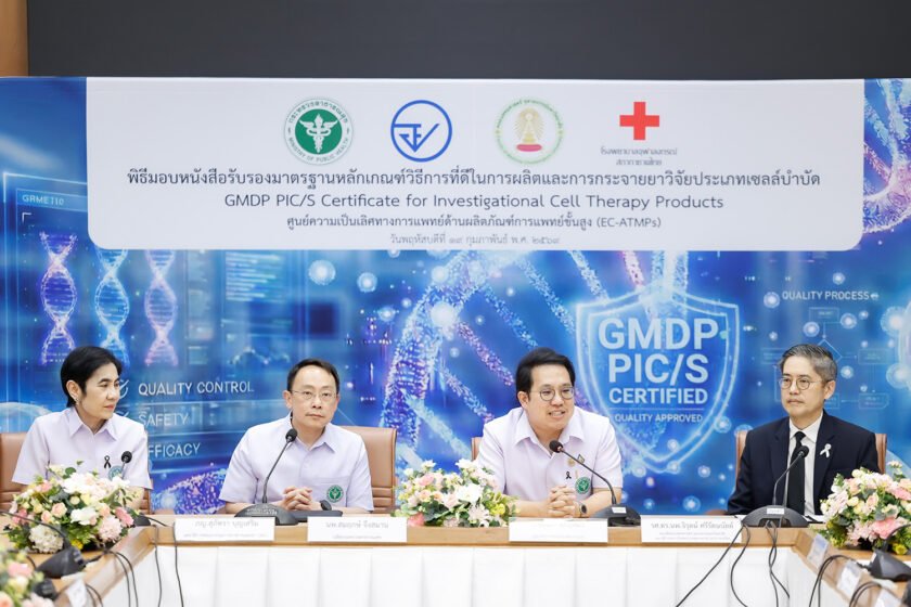 วันที่ 19 กุมภาพันธ์ 2569 ณ ห้องประชุม 2 อาคาร 1 ชั้น 2 สำนักงานปลัดกระทรวงสาธารณสุข มีพิธีมอบหนังสือรับรองมาตรฐานหลักเกณฑ์วิธีการที่ดีในการผลิตและกระจายยาวิจัยประเภทเซลล์บำบัด (GMDP PIC/S Certificate for Investigational Cell Therapy Products) ให้แก่ ศูนย์ความเป็นเลิศทางการแพทย์ด้านผลิตภัณฑ์การแพทย์ขั้นสูง (EC-ATMPs) ภายใต้ โรงพยาบาลจุฬาลงกรณ์ สภากาชาดไทย และ คณะแพทยศาสตร์ จุฬาลงกรณ์มหาวิทยาลัย โดยความร่วมมือของ กระทรวงสาธารณสุข และ สำนักงานคณะกรรมการอาหารและยา เพื่อรับรองมาตรฐานการผลิต Mesenchymal Stem Cells (MSCs) สำหรับการศึกษาวิจัยในมนุษย์ตามแนวทาง Pharmaceutical Inspection Co-operation Scheme (PIC/S)