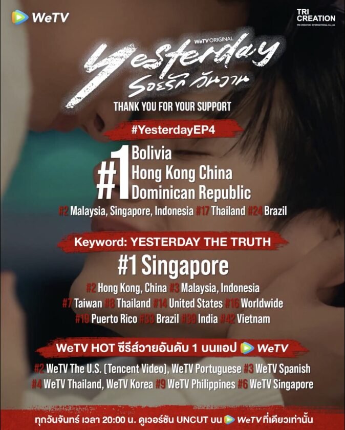 ตอกย้ำความปังสมฉายา “ซีรีส์ที่เจ็บที่สุดแห่งปี” อย่างต่อเนื่อง สำหรับ WeTV Original “Yesterday รอยรักวันวาน” ที่ได้สองนักแสดงมากฝีมือ “ฟอร์ด ฐิติพงศ์” และ “พีท วสุธร” มาถ่ายทอดบทบาทรักร้าวของ “เวียร์-เคลวิน” ได้อย่างเข้มข้นทุกมิติ จนพาคนดูอินกระแทกอารมณ์ ฟาดดราม่าสะเทือนทั้งไทม์ไลน์ ล่าสุดยังคงสร้างปรากฏการณ์แรงไม่หยุด พุ่งขึ้นแท่นซีรีส์วายมาแรงอันดับ 1 บนแอป WeTV ติดต่อกัน 3 สัปดาห์ซ้อน พร้อมทะยานติดเทรนด์ X ในหลายพื้นที่ทั่วโลกอย่างรวดเร็ว