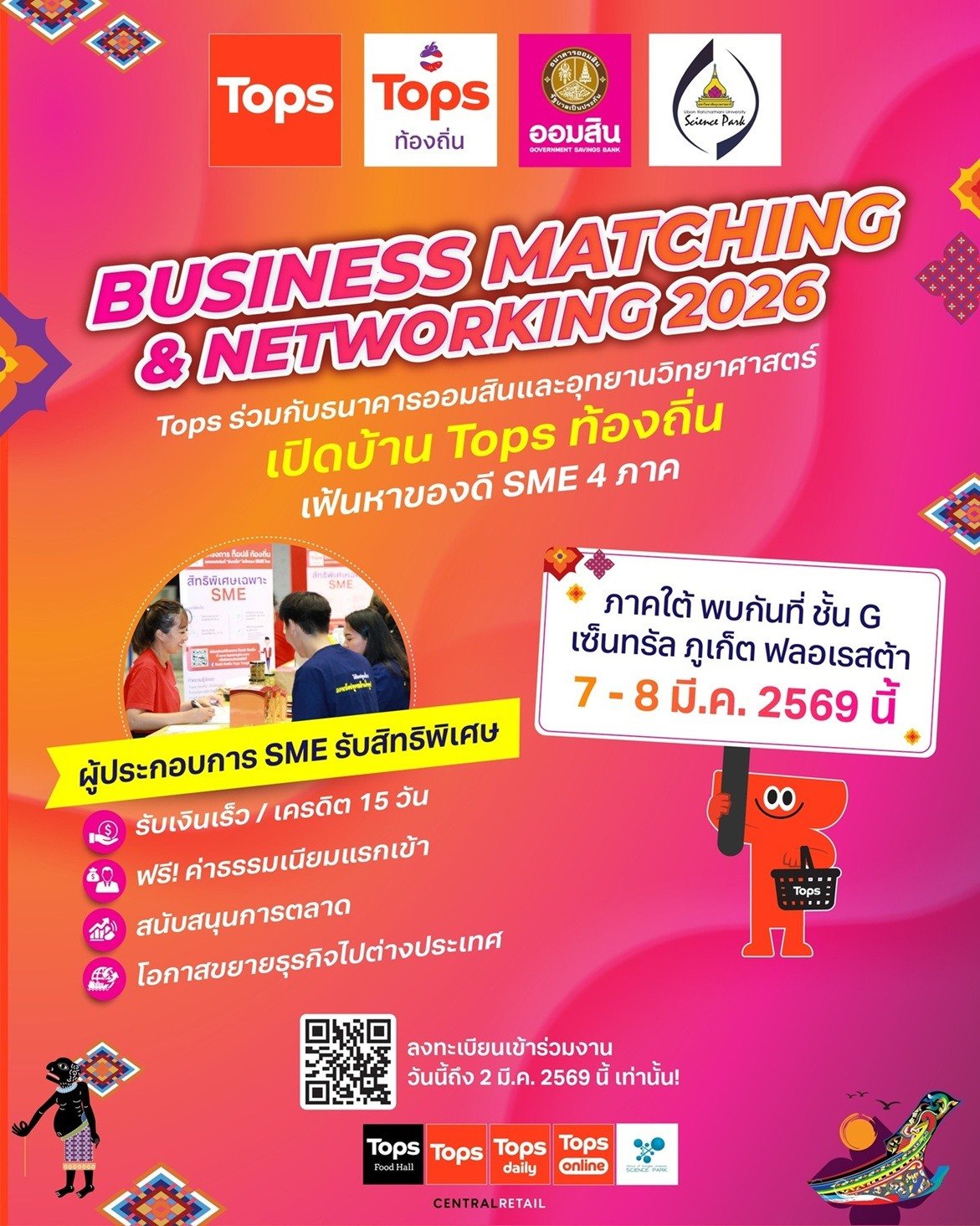 ถึงเวลาที่ของดีภาคใต้จะได้ไปไกลกว่าเดิม! ท็อปส์ ในเครือเซ็นทรัล รีเทล ผนึกกำลังธนาคารออมสิน และอุทยานวิทยาศาสตร์ มหาวิทยาลัยสงขลานครินทร์ ชวนผู้ประกอบการ SME ภาคใต้ คว้าโอกาสครั้งสำคัญในงาน “เปิดบ้าน TOPS ท้องถิ่น คัดสรรของดี SME 4 ภาค Discover the Best of Local SMEs” เปิดรับสิทธิ์พิจารณาเข้า TOPS เป็นลำดับแรก! ให้ผู้ประกอบการเข้าพบทีมจัดซื้อ TOPS ท้องถิ่น ในรูปแบบ Business Matching ตัวต่อตัว เพื่อนำเสนอสินค้าและต่อยอดศักยภาพแบรนด์ พร้อมรับคำแนะนำเชิงลึกครบทุกมิติ ตั้งแต่การพัฒนาผลิตภัณฑ์ มาตรฐานการผลิต บรรจุภัณฑ์ ไปจนถึงกลยุทธ์การตลาด เพื่อยกระดับความพร้อมสู่โมเดิร์นเทรด ต่อยอดสู่การวางจำหน่ายบนชั้นวางท็อปส์ทั่วประเทศในอนาคต นอกจากนี้ จะได้พบกับผู้ประกอบการในเครือข่ายของโครงการ อาทิ Think of Thailand, ริน,