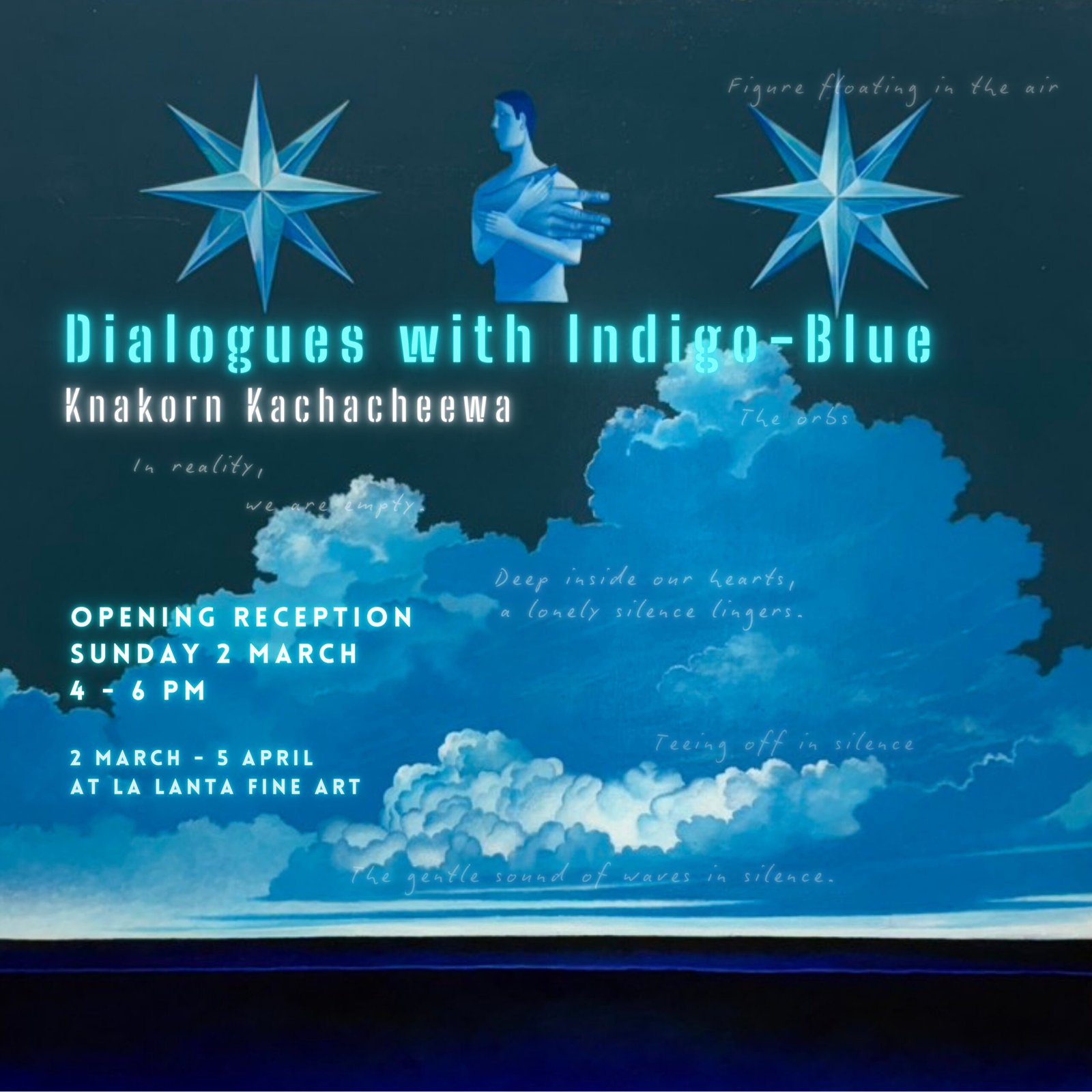 ละลานตา ไฟน์อาร์ต มีความยินดีนำเสนอนิทรรศการโดย คณากร คชาชีวะ ผลงานที่สร้างบทสนทนาภายในจิตใจของศิลปินที่สำรวจพรมแดนของตัวตน ผ่านชุดผลงานจิตรกรรมในกลุ่มโทนสี Indigo-Blue ควบคู่ไปกับงานประติมากรรมที่เป็นดั่งสมุดบันทึกของความเงียบเหงาและโดดเดี่ยว ในช่วงเวลาที่ความสัมพันธ์ระหว่างศิลปินและโลกรอบๆตัวห่างเหินออกไปเรื่อยๆ
