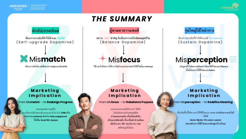 - Silver Generation (45-69 ปี) – รุ่นใหญ่ใช้ใจนำทาง เพราะชีวิตที่ดีคือการมี “ความหมาย” จึงต้อง พลังแห่งการหล่อเลี้ยงชีวิตด้วยความหมาย (Sustain Dopamine) โดยให้คุณค่ากับความหมายของชีวิต (41.5%) อิสระในการใช้ชีวิต (31.2%) ข้อมูลที่น่าสนใจคือพวกเขาไม่ได้ต้องการใช้ชีวิตแบบ Passive แต่ยังกระตือรือร้นที่จะพัฒนาทักษะใหม่ (49%) และเปิดรับสิ่งใหม่ ๆ (16%) สิ่งนี้สะท้อนภาวะ Misperception หรือ การเข้าใจผิด ระหว่าง ภาพจำของสังคม กับ ความจริงของหัวใจ ที่สังคมมักมองว่าการมีอายุมากขึ้นควรใช้ชีวิตช้าลง ทั้งที่ในความเป็นจริงแรงขับภายในของคนกลุ่มนี้ยังคง Active และมุ่งหาความหมายของชีวิตในรูปแบบของตนเอง