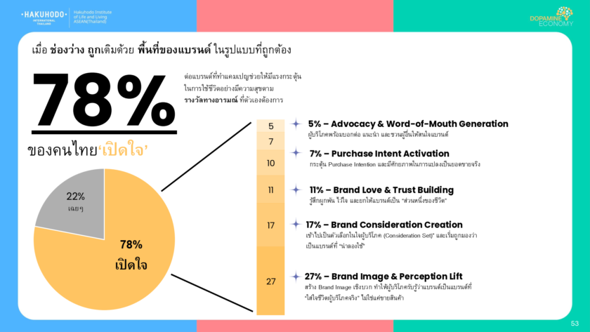 และแน่นอนว่า เมื่อช่องว่างถูกเติมด้วยพื้นที่ของแบรนด์ ในรูปแบบที่ถูกต้อง กว่า 78% ของคนไทยก็พร้อม ‘เปิดใจ’ ต่อแบรนด์ที่ทำแคมเปญช่วยให้มีแรงกระตุ้น ในการใช้ชีวิตอย่างมีความสุขตามรางวัลทางอารมณ์ ที่ตัวเองต้องการ