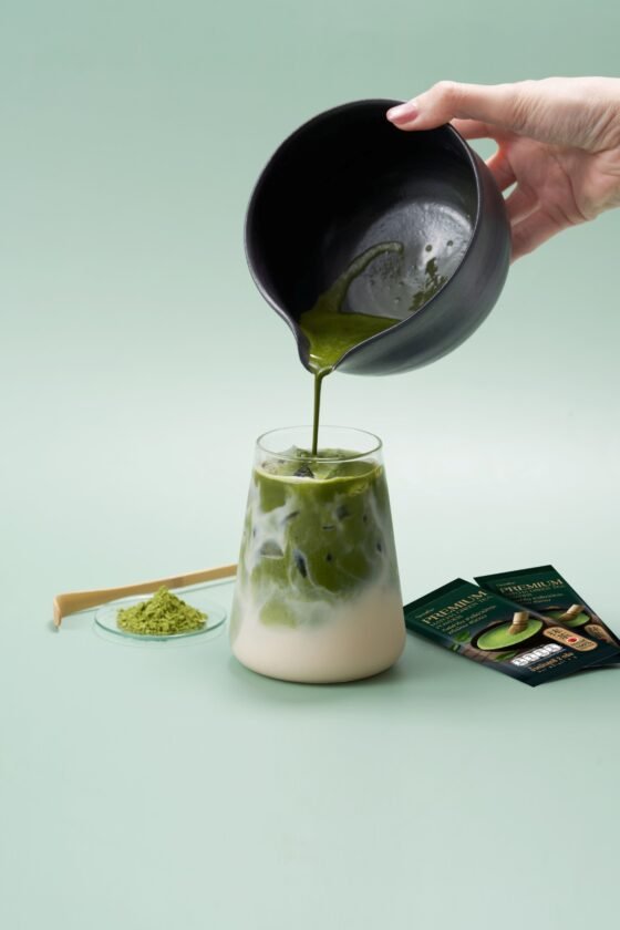 - สูตรเพียวมัทฉะ เทผงมัทฉะ 1 ซอง ลงในถ้วย ผสมน้ำเปล่า 160 – 200 มล. คนให้เข้ากัน เทลงแก้ว เติมน้ำแข็งตามชอบ