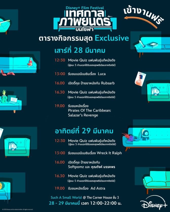 เตรียมตัวให้พร้อมกับที่สุดของแคมเปญแห่งปีที่คอหนังตัวจริงห้ามพลาดร่วมเปิดประสบการณ์และสร้างความทรงจำดี ๆ ในงาน “Disney+ Film Festival เทศกาลภาพยนตร์บนโซฟา” อีเวนต์ที่คุณจะได้สัมผัสโลกแห่งภาพยนตร์ครบทุกมุมมอง พร้อมเปลี่ยนพื้นที่ของ Such a Small World ให้กลายเป็นอีกมิติที่รวมทุกองค์ประกอบหลังม่านมาไว้ในที่เดียว Disney+ ขอเชิญชวนทุกคนมาค้นพบมนต์เสน่ห์ของภาพยนตร์จากหลากหลายสตูดิโอระดับโลก ไม่ว่าจะเป็น Disney, Pixar, Marvel, Star Wars, 20th Century Studios, Searchlight Pictures รวมถึงภาพยนตร์ไทยจาก GDH และอีกมากมายที่ครองใจผู้ชมมาอย่างยาวนาน