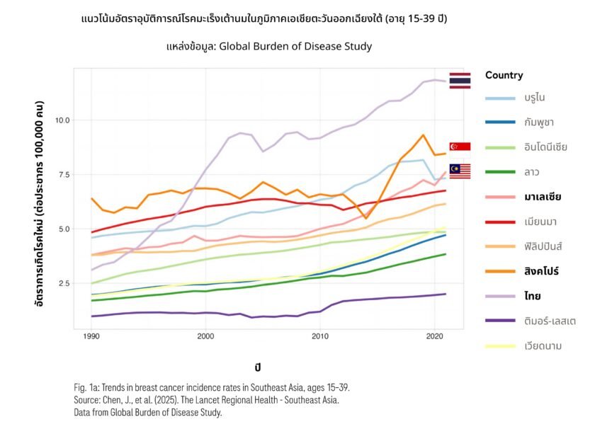 ประเทศไทยมีอัตราการเกิดมะเร็งเต้านมในผู้หญิงอายุ 15–39 ปี สูงที่สุดอยู่ที่ 11.78 รายต่อประชากรผู้หญิง 100,000 คน รองลงมาคือสิงคโปร์ (8.46) และมาเลเซีย (7.64)