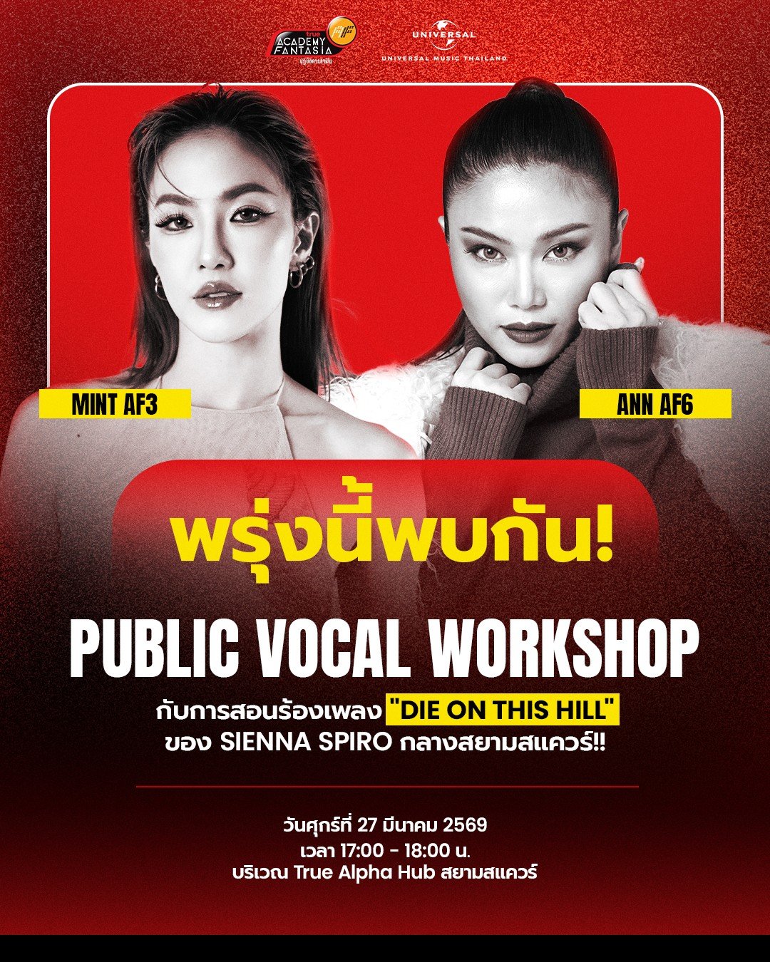 True AF จับมือ Universal Music Thailand สนับสนุนทุกความฝันให้เป็นจริง เปิดโอกาสให้คนที่อยากเป็นนักล่าฝันทุกคนได้เตรียมตัวรอบสุดท้าย ก่อนเข้าสู่รอบออดิชั่นภาคกลางกับคลาสติวเข้มจาก “มิ้น AF3” และ “แอน AF6” ที่จะมาสอนเทคนิคการออดิชั่นก่อนเข้าบ้าน AF แบบที่ไม่เคยแชร์ที่ไหนมาก่อน