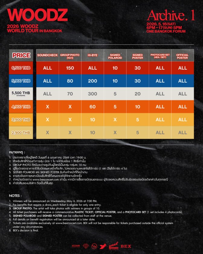 แฟน ๆ ชาวไทยเตรียมกาวันในปฏิทินให้พร้อม แล้วมาเจอกันในงาน “2026 WOODZ WORLD TOUR ‘Archive. 1’ IN BANGKOK” ที่จะถูกจัดขึ้น 2 รอบการแสดงในวันเสาร์ที่ 16 พฤษภาคม 2569 เวลา 18:00 น. และวันอาทิตย์ที่ 17 พฤษภาคม 2569 เวลา 17:00 น. ณ One Bangkok Forum บัตรราคา 6,500 / 5,900 / 5,500 (บัตรยืน) / 4,900 / 3,900 และ 2,900 บาท โดยแต่ละราคาจะได้รับสิทธิพิเศษ ดังนี้