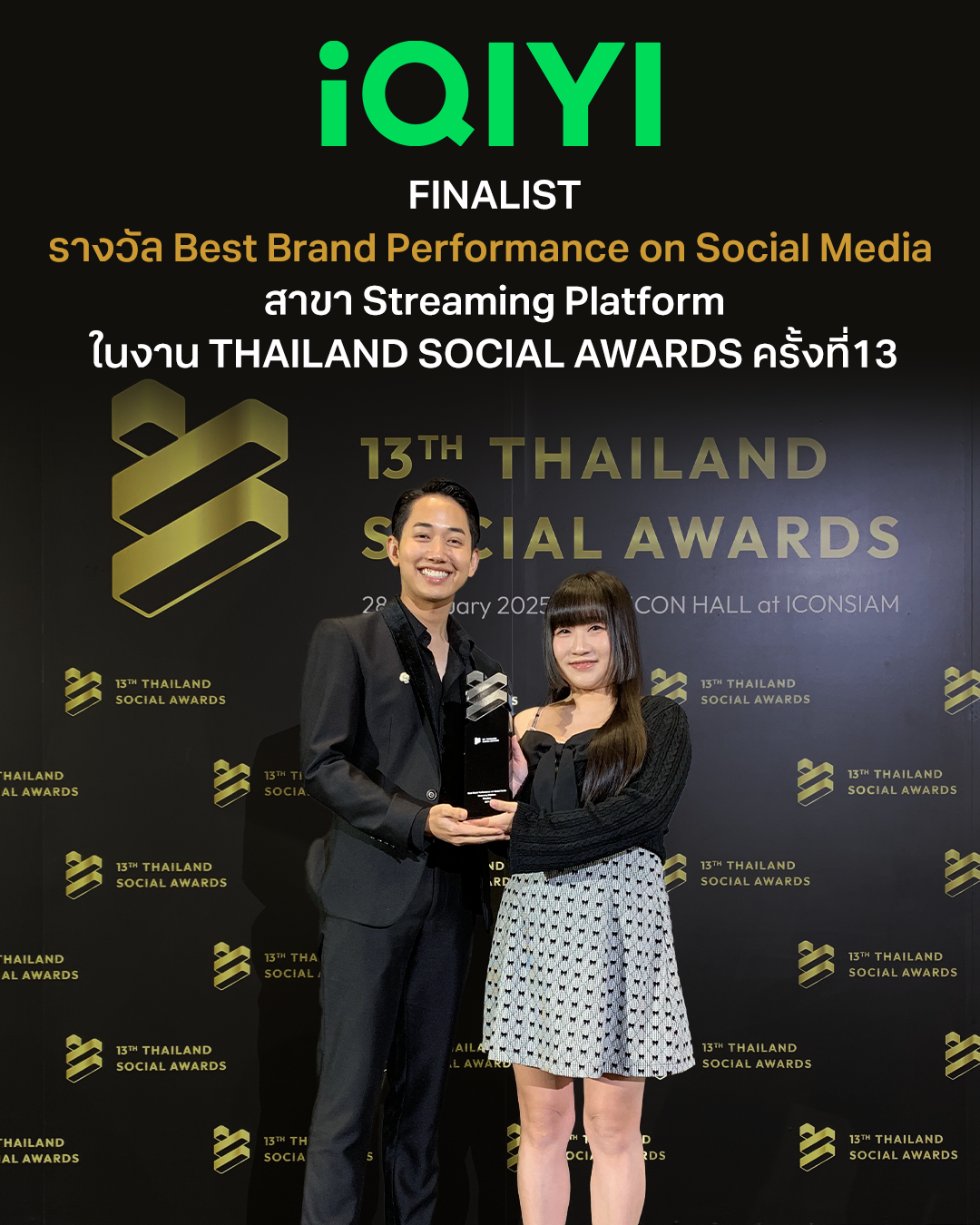 สร้างปรากฏการณ์อย่างต่อเนื่อง สมกับเป็นบ้านของความบันเทิงยอดนิยมแห่งเอเชียสำหรับ iQIYI (อ้ายฉีอี้) ที่นอกจากจะมอบคอนเทนต์คุณภาพระดับพรีเมียมของเอเชีย และสร้างความบันเทิงหลากหลายรูปแบบให้แฟน ๆ ทั่วโลกได้รับชมตลอดหลายปีที่ผ่านมา ล่าสุดยังได้ประกาศความเป็นที่หนึ่ง คว้ารางวัล Finalist ประเภท Best Brand Performance on Social Media สาขา Streaming Platform โดยเป็น 1 ใน 5 แบรนด์แพลตฟอร์มบันเทิงออนไลน์ที่ทำผลงานโดดเด่นบนโซเชียลมีเดีย ในงานประกาศรางวัล Thailand Social Awards ครั้งที่ 13 ที่ถูกจัดขึ้นเพื่อให้ความสำคัญกับวงการโซเชียล ที่เป็นส่วนหนึ่งในการขับเคลื่อนเศรษฐกิจภาพรวมของประเทศ อีกทั้งยังร่วมส่งเสริมการใช้โซเชียลมีเดียอย่างสร้างสรรค์ และยกระดับวงการโซเชียล ด้วยการมอบรางวัลเชิดชูผู้ใช้โซเชียลมีเดียยอดเยี่ยมในสาขาต่าง ๆ โดยได้รับเกียรติจากคุณผ่านศึก ธงรบ และ คุณโคโค่ หยาง กรรมการผู้จัดการร่วม iQIYI ประเทศไทย เป็นตัวแทนรับรางวัล เมื่อวันที่ 28 กุมภาพันธ์ที่ผ่านมา ณ ทรู ไอคอน ฮอลล์ ไอคอนสยาม