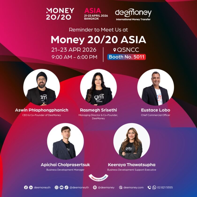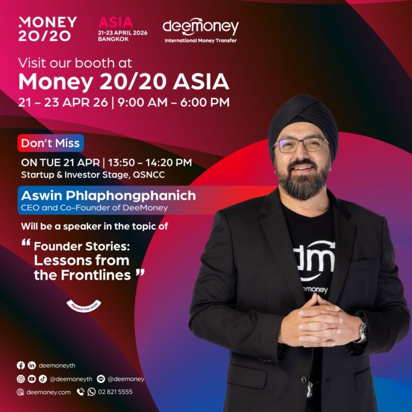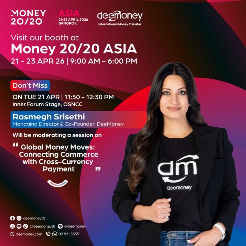คณะผู้บริหารจาก DeeMoney จะขึ้นเวทีงาน Money20/20 Asia ในวันที่ 21 เมษายน เพื่อร่วมสนทนาเกี่ยวกับอนาคตของแวดวงการเงิน โดย นายอัศวิน พลพงศ์พาณิชย์ ประธานเจ้าหน้าที่บริหารและผู้ก่อตั้ง จะร่วมแบ่งปันมุมมองและบทเรียนเชิงลึกในฐานะผู้ประกอบการ ในหัวข้อ “Founder Stories: Lessons from the Frontlines” ขณะที่ นางรัศเมฆศรีเศรษฐีกรรมการผู้จัดการและผู้ร่วมก่อตั้ง รับหน้าที่ผู้ดำเนินรายการในเวทีเสวนาเชิงกลยุทธ์ในหัวข้อ “Global Money Moves: Connecting Commerce with Cross-Currency Payments” เพื่อทำความเข้าใจความซับซ้อนของการค้าระหว่างประเทศยุคใหม่ และตอกย้ำบทบาทการเป็นผู้นำทางความคิดของบริษัท