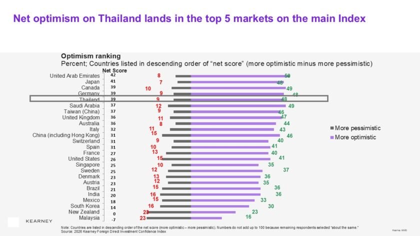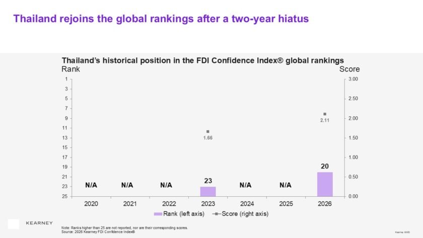 กรุงเทพฯ 20 เมษายน 2569 — ประเทศไทยกลับมาติด 25 อันดับแรกของดัชนีความเชื่อมั่นด้านการลงทุนโดยตรงจากต่างประเทศ (FDICI) ของคาร์นีย์ (Kearney) ในปี 2569 (Kearney’s 2026 FDI Confidence Index®) หลังจากครั้งล่าสุดในปี 2566 โดยการสำรวจผู้บริหารธุรกิจระดับโลกประจำปีนี้ได้จัดอันดับตลาดที่มีแนวโน้มสูงสุดในการดึงดูดการลงทุนโดยตรงจากต่างประเทศ (FDI) ในช่วง 3 ปีข้างหน้า
