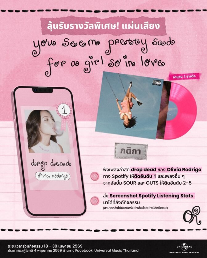 งานจบแล้ว แต่แฟน ๆ ยังลุ้นของรางวัลกันต่อได้อีกถึง 2 กิจกรรม ลุ้นรับแผ่นไวนิลของ Olivia Rodrigo อัลบั้ม you seem pretty sad for a girl so in love จำนวน 1 รางวัล เพียงแค่ฟังเพลง “drop dead” ใน Spotify ฟังบ่อย ๆ จนติด Spotify Listening Stats อันดับ 1 แล้วมีเพลงอื่น ๆ ของ Olivia Rodrigo จากอัลบั้ม SOUR และ GUTS อยู่ในอันดับที่ 2-5 กด screencapture หน้าจอ แล้วส่งภาพมาในลิงก์กิจกรรมใน Facebook และ Instagram ของ Universal Music Thailand สามารถร่วมสนุกได้ตั้งแต่วันนี้-30 เมษายนนี้