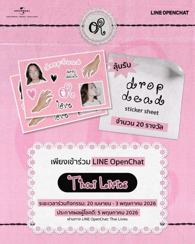 กิจกรรมที่ 2 ง่ายยิ่งกว่าเดิม เพียงแค่เข้าห้อง LINE OpenChat Thai Livies และตอบคำถามในแคมเปญลิงก์ในห้องแชต เริ่มตั้งแต่วันที่ 20 เมษายน-3 พฤษภาคมนี้ ก็มีสิทธิ์ลุ้นรับ Olivia Rodrigo drop dead sticker sheets สุด Exclusive จำนวน 20 รางวัล ประกาศรายชื่อผู้โชคดีใน LINE OpenChat วันที่ 5 พฤษภาคมนี้