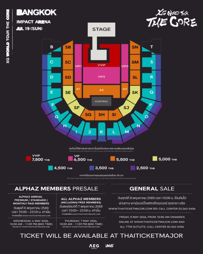 สำหรับเหล่าหมาป่าที่เตรียมร่วมสัมผัสประสบการณ์ระดับโลก เตรียมตัวให้พร้อม! บัตรเข้าชมงาน XG WORLD TOUR: THE CORE IN BANGKOK ราคาเริ่มต้นที่ 2,500 บาท โดยแฟนคลับตัวจริงสามารถคว้าสิทธิ์จับจองที่นั่งก่อนใครในรอบ ALPHAZ ANNUAL PREMIUM/STANDARD・MONTHLY PAID MEMBERS PRESALE ในวันพุธที่ 6 พฤษภาคม 2569 เวลา 10.00 – 23.59 น. และเปิดขายบัตรรอบ ALL ALPHAZ MEMBERS (INCLUDING FREE MEMBERS) PRESALE ในวันพฤหัสบดีที่ 7 พฤษภาคม 2569 เวลา 10.00 – 23.59 น. ผ่านทาง www.thaiticketmajor.com (ดูรายละเอียดเพิ่มเติมเกี่ยวกับรอบ ALPHAZ Pre-Sale ได้ที่ http://xgalx.com/) สำหรับรอบจำหน่ายบัตรทั่วไป จะเริ่มเปิดขายในวันศุกร์ที่ 8 พฤษภาคม 2569 เวลา 10.00 น. เป็นต้นไป ผ่านทาง www.thaiticketmajor.com หรือ เคาน์เตอร์ไทยทิกเก็ตเมเจอร์ทุกสาขา Call Center 02-262-3456