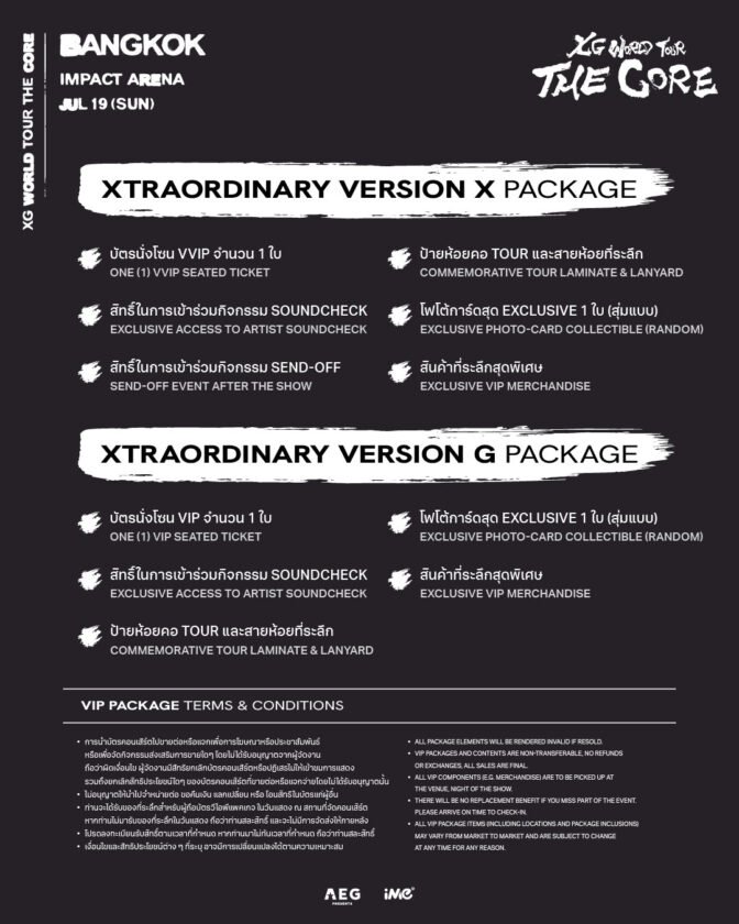 หลังจากความสำเร็จอย่างท่วมท้นจนฉุดไม่อยู่ สมาชิกทั้ง 7 คนของ XG อันประกอบไปด้วย จูริน (JURIN), จิสะ(CHISA), ฮินาตะ (HINATA), ฮาร์วีย์ (HARVEY), จูเรีย (JURIA), มายะ (MAYA) และ โคโคนะ (COCONA) พร้อมแล้วที่จะปลดปล่อยพลังที่แท้จริงจากภายในสู่การเดินทางครั้งใหม่ใน “XG WORLD TOUR: THE CORE” ซึ่งทัวร์ครั้งนี้ได้เปิดตัวอย่างสวยงามในประเทศญี่ปุ่นด้วยกระแสตอบรับอย่างมหาศาล จนสามารถสร้างสถิติบัตรจำหน่ายหมดเกลี้ยง (Sold Out) ในหลายเมืองใหญ่ อาทิ โยโกฮามา, โอซาก้า, นาโกย่า และเมืองอื่นๆ ภายในทัวร์ครั้งนี้ แฟนๆ จะได้ชมการแสดงในเพลงฮิตที่คุ้นเคยอย่าง ‘LEFT RIGHT’ และ ‘WOKE UP’ รวมถึงเพลงใหม่ล่าสุดอย่าง ‘HYPNOTIZE’ และ ‘ROCK THE BOAT’ และตอนนี้ถึงเวลาแล้วที่ XG จะนำประสบการณ์การแสดงที่ทลายทุกขีดจำกัด และความสร้างสรรค์ที่เหนือจินตนาการมาสู่กรุงเทพฯ ในเดือนกรกฎาคมนี้ โดยจะมาพร้อมกับโปรดักชันที่ยิ่งใหญ่ และอลังการกว่าที่เคยมีมา!