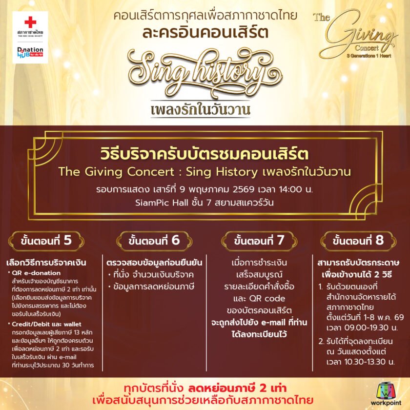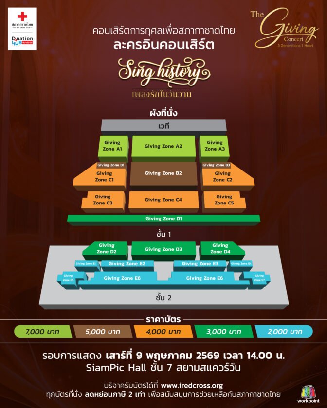 THE GIVING CONCERT ที่ 1: Sing History เพลงรักในวันวานคอนเสิร์ตที่ถ่ายทอดพลังแห่งการให้ในรูปแบบ Story Concert พาย้อนวันวานไปกับบทเพลงอันไพเราะจากภาพยนตร์และละครในความทรงจำ เชื่อมโยงเหตุการณ์สำคัญๆ ของสภากาชาดไทย ให้ทุกคนซาบซึ้งไปกับบทเพลงแห่งความทรงจำจาก โหมโรง เดอะมิวสิคัล, สุนทราภรณ์ เดอะมิวสิคัล, ทองกวาว เดอะมิวสิคัล และการแสดงของนักร้องคุณภาพบนเวทีเดียวกัน