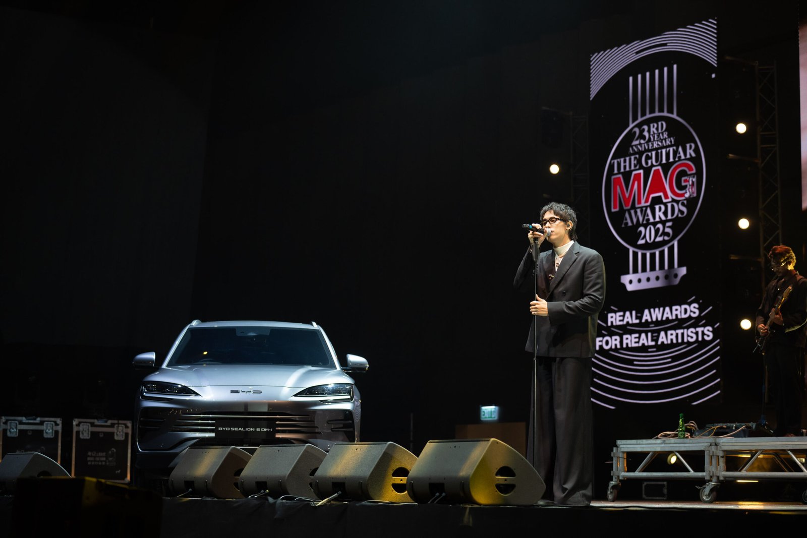 นอกจากจะได้ร่วมลุ้นผลรางวัล The Guitar Mag Award 2025 และได้พบกับทัพศิลปินชื่อดังระดับแนวหน้าของประเทศอย่างใกล้ชิดแล้ว ลูกค้าเรเว่ที่เข้าร่วมงานยังได้สัมผัสกับ BYD Sealion 7 ขุมพลังไฟฟ้าซึ่งจัดแสดงอยู่หน้างาน พร้อมแสดงศักยภาพของระบบ VtoL (Vehicle to Load) ซึ่งสามารถจ่ายพลังงานไฟฟ้าจากภายในรถไปยังเครื่องใช้ไฟฟ้า โดย BYD Sealion 7 จ่ายกระแสไฟให้กับเครื่องดนตรีและเครื่องเสียง ไม่ว่าจะเป็น กลองไฟฟ้า กีตาร์ไฟฟ้า เบส คีย์บอร์ด รวมถึงลำโพงในการกระจายเสียงอีกด้วย ส่วน BYD Sealion 6 DM-i ขุมพลัง DM-i Super Hybrid ที่จอดบนเวทีและได้แสดงร่วมกับ แพทริค อนันดา นักร้องชื่อดัง นอกจากจะอวดรูปลักษณ์ที่โฉบเฉี่ยว ดุดัน ตามแบบฉบับการออกแบบของ BYD แล้ว ยังมีการแสดงของระบบ VtoL ให้เห็นกันสดๆ ในโชว์อีกด้วย