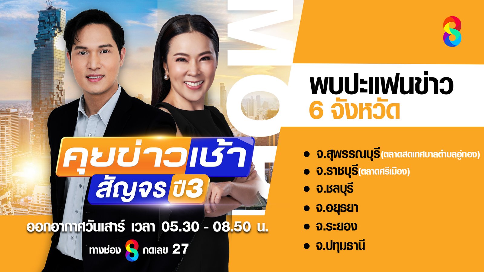เตรียมพบกับการกลับมาอย่างยิ่งใหญ่ของ “คุยข่าวเช้าสัญจรปี 3″ จาก ช่อง 8 ในเครือ อาร์เอสกรุ๊ป ที่จะพาทุกท่านไปล่องทัวร์ตลาดสด 6 จังหวัดทั่วไทย กับผู้ประกาศข่าวขวัญใจมหาชน ก้อย–บุญญิตา งามศัพพศิลป์ และ ต๊ะ–ภัทรพล นิธิวรพล ที่จะมารายงานข่าวกันแบบสดๆ กลางตลาดเต็มอิ่มกว่า 3 ชั่วโมง รวมถึงพรีเซนต์ของสด ของคาว ของหวาน ของดีของเด็ดประจำตลาด แบบแนบชิดใกล้จัดเต็ม อีกทั้งยังมีกิจกรรมปลุกพลังยามเช้า ที่จะทำให้ทุกเช้าของคุณไม่เหมือนเดิม โดยคุยข่าวเช้าสัญจร ปี 3 ในปีนี้ไปด้วยกันถึง 6 จังหวัด ได้แก่ สุพรรณบุรี, ราชบุรี, ชลบุรี, อยุธยา, ระยอง และ ปทุมธานี พร้อมแจกของรางวัลมากมายทั้งทางหน้าจอและทางแพลตฟอร์มออนไลน์! งานนี้ประชาชนที่ออกมาจับจ่ายซื้อของช่วงเช้า เตรียมเจอกับความสนุกสนานแบบเต็มพิกัดไปเลย