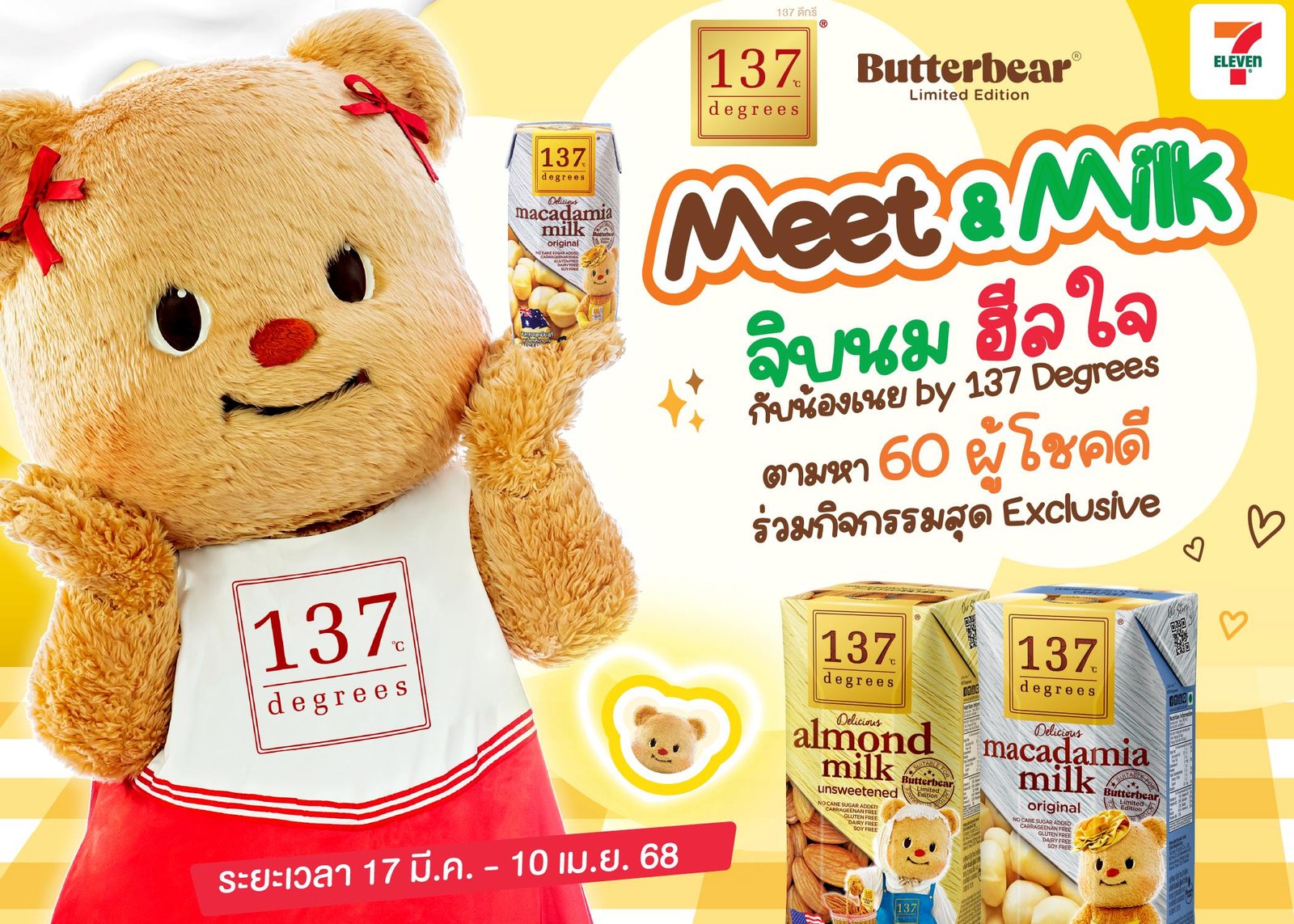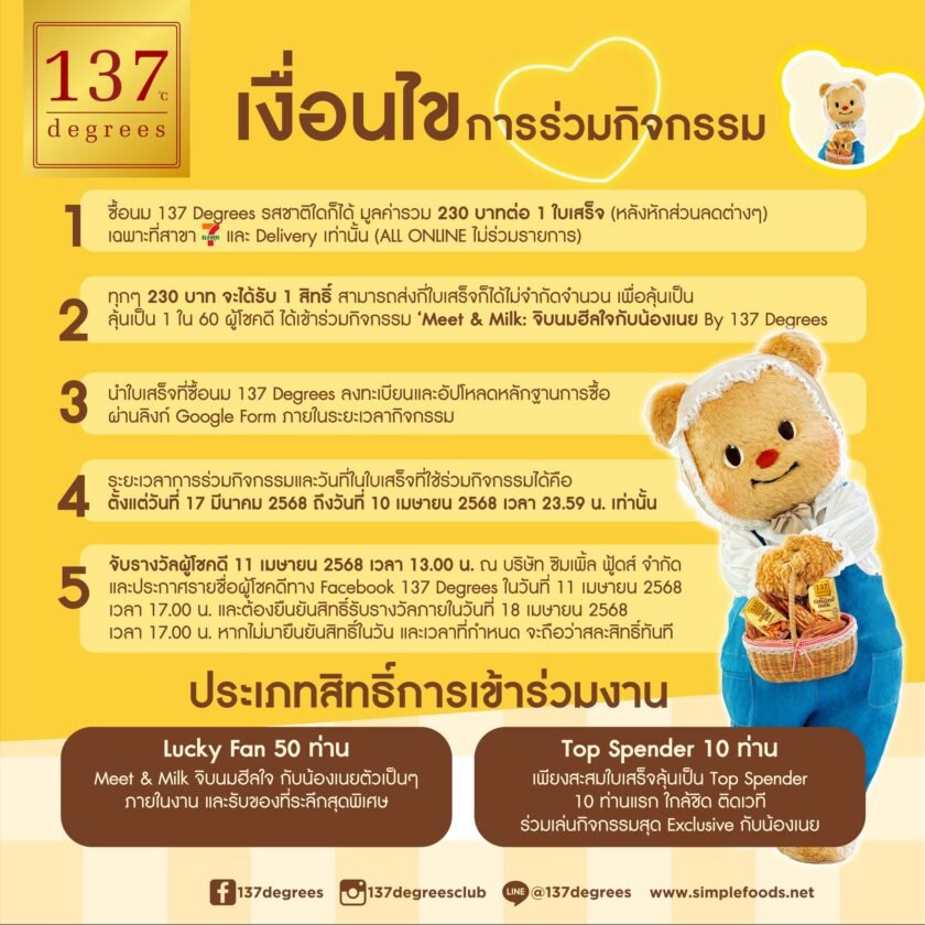 บริษัท ซิมเพิ้ล ฟู้ดส์ จำกัด ภายใต้แบรนด์ 137 ดีกรี® ผลิตภัณฑ์นมทางเลือกอันดับหนึ่งของไทย ปัจจุบัน ผลิตภัณฑ์มีวางจำหน่ายกว่า 30 ประเทศทั่วโลก ทาง 137 ดีกรี® จึงจัดกิจกรรมสุดเอ็กซ์คลูซีฟสำหรับมัมหมี พ่อหมี และลูกค้า 137 ดีกรี® เนรมิตกิจกรรมสุดพิเศษ Meet & Milk: จิบนมฮีลใจกับน้องเนย By 137 Degrees ให้ได้มีโมเมนต์พิเศษ ร่วมกับน้องเนยอย่างใกล้ชิด รับรองว่าจะเติมเต็มความสุขให้กับทุกคนอย่างแน่นอน เพียงซื้อนม 137 ดีกรี® รสชาติใดก็ได้ มูลค่ารวม 230 บาทต่อ 1 ใบเสร็จ ตั้งแต่วันที่ 17 มีนาคม 2568 – 11 เมษายน 2568 ที่ร้าน 7-Eleven และ 7-Eleven Delivery เท่านั้น (ไม่รวม 7-Eleven Online)