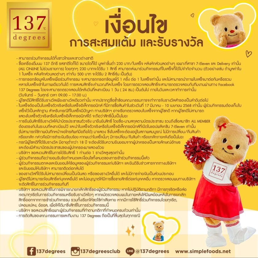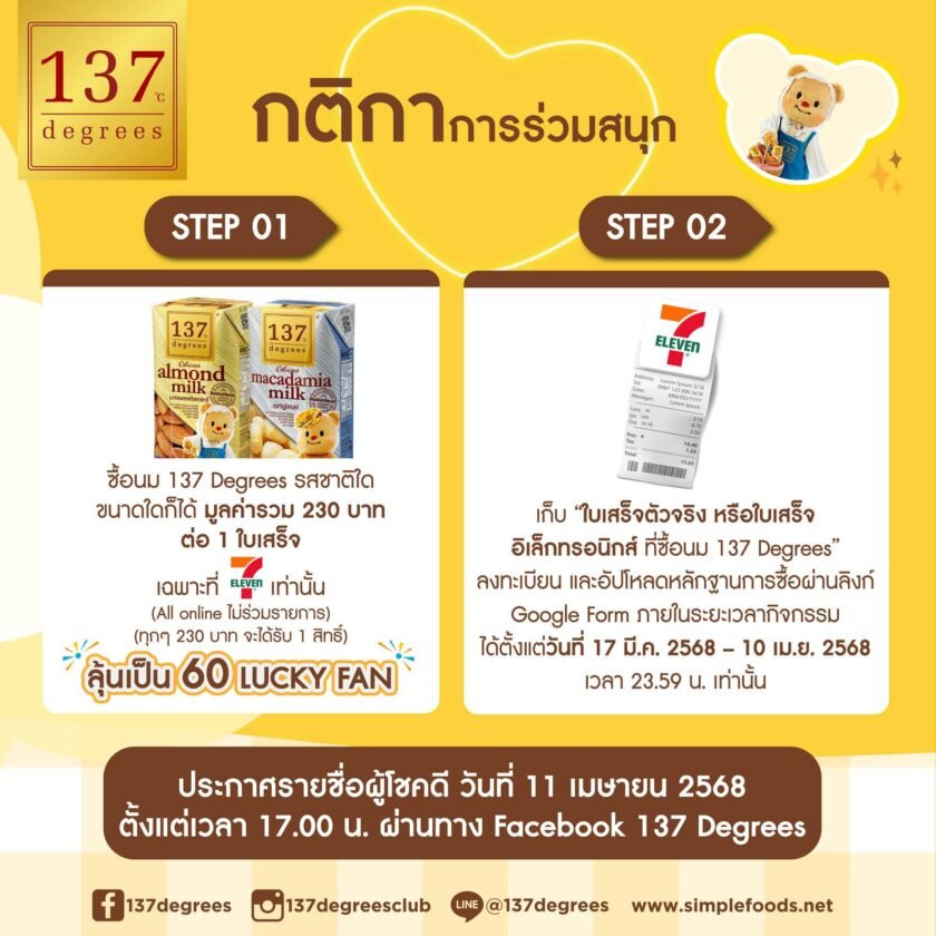 - ประกาศรายชื่อผู้โชคดีทั้ง 60 ท่าน วันที่ 11 เมษายน 2568 เวลา 17.00 ทางเพจเฟซบุ๊ก 137degrees
