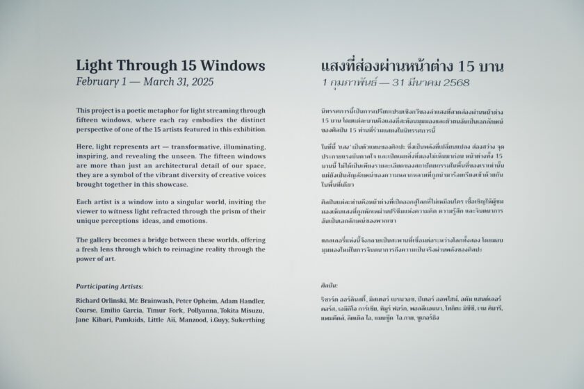 นิทรรศการ “แสงที่ส่องผ่านหน้าต่าง 15 บาน” จัดขึ้นในพื้นที่กว่า 700 ตารางเมตรของ Agni Gallery แกลเลอรีศิลปะร่วมสมัยแห่งใหม่ ในย่านลุมพินีซึ่งเต็มไปด้วยชีวิตชีวา