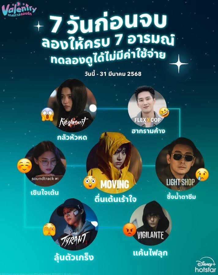 ในช่วงโค้งสุดท้ายของแคมเปญนี้ Disney+ Hotstar ขอนำเสนอไฮไลท์คอนเทนต์ที่จะพาคุณสัมผัส 7 อารมณ์สุดพิเศษก่อนที่แคมเปญจะสิ้นสุด! เตรียมกลัวหัวหดกับ Revenant (ตอนที่ 1-2) ที่เต็มไปด้วยความตื่นเต้นและลุ้นระทึก, ฮากรามค้างกับ Flex x Cop (ตอนที่ 1-2) กับคาแร็กเตอร์สุดฮาที่จะทำให้ขำไม่หยุด, ซึ้งน้ำตาซึมกับ Light Shop (ตอนที่ 1-4) ซีรีส์ที่ถ่ายทอดความสัมพันธ์ลึกซึ้งระหว่างคนเป็นและคนตาย, ตื่นเต้นเร้าใจกับ Moving (ตอนที่ 1-5) ที่เต็มไปด้วยการผจญภัยเหนือธรรมชาติที่ไม่เหมือนใคร, เขินใจเต้นกับ Soundtrack #1 (ตอนที่ 1-2) ที่จังหวะรักจะทำให้หัวใจคุณเต้นตาม, ลุ้นตัวเกร็งกับ The Tyrant (ตอนที่ 1-2) ซีรีส์ดราม่าที่เต็มไปด้วยความขัดแย้งและความท้าทายทางอำนาจ, และแค้นไฟลุกกับ Vigilante (ตอนที่ 1-2) ที่พาคุณไปสู่การแก้แค้นที่ร้อนแรงและเต็มไปด้วยความเข้มข้น!