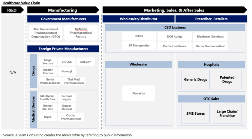 ในด้านอุปทาน ประเทศไทยมีห่วงโซ่อุปทานด้านสาธารณสุขที่แข็งแกร่ง ครอบคลุมตั้งแต่ผู้ผลิตยาและอุปกรณ์การแพทย์ระดับนานาชาติ ผู้ผลิตภาครัฐ ผู้ค้าส่ง และบริษัทตัวแทนจำหน่าย โครงสร้างพื้นฐานที่แข็งแกร่งนี้มีบทบาทสำคัญในการสนับสนุนการเติบโตของอุตสาหกรรมยาและสุขภาพของไทย พร้อมทั้งเสริมภาพลักษณ์ของประเทศในฐานะจุดหมายปลายทางด้านการท่องเที่ยวเชิงการแพทย์อีกด้วย นอกจากนี้ ระบบดังกล่าวยังเอื้อให้ผู้เล่นรายใหม่สามารถเข้าถึงเครือข่ายจัดจำหน่ายที่มีอยู่เดิม การสนับสนุนด้านกฎระเบียบ และกระบวนการทางการค้าที่ยืดหยุ่น ช่วยลดอุปสรรคในการเข้าสู่ตลาดอย่างมีนัยสำคัญ อย่างไรก็ตาม หนึ่งในความท้าทายที่ไม่อาจมองข้าม คือการแข่งขันจากผู้ผลิตภาครัฐ ซึ่งสามารถผลิตและจำหน่ายยาชื่อสามัญที่เป็นที่ต้องการของตลาดในราคาที่ถูกกว่า อาจส่งผลให้บริษัทเอกชนที่มีผลิตภัณฑ์ใกล้เคียงกัน ต้องเผชิญกับข้อจำกัดในการทำตลาดและแข่งขันด้านราคาอย่างเข้มข้น