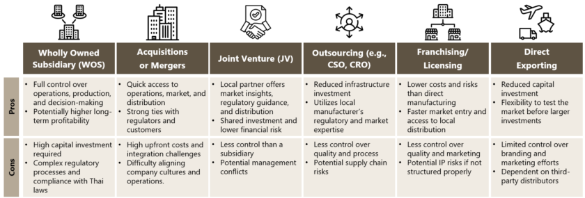 ทั้งนี้ ผู้ประกอบการควรประเมินทั้งอุปสงค์และการแข่งขันในตลาด โดยเฉพาะในบริบทของสังคมผู้สูงอายุของไทยที่กำลังขยายตัวอย่างรวดเร็ว และเป็นปัจจัยสำคัญที่ผลักดันความต้องการด้านบริการสุขภาพและผลิตภัณฑ์ชีวเภสัชภัณฑ์ (Biopharmaceuticals) อย่างต่อเนื่อง ขณะที่ภาคค้าปลีกและตัวแทนจัดจำหน่ายกลับต้องเผชิญกับการแข่งขันที่รุนแรง รัฐบาลไทยยังมีมาตรการจูงใจที่ช่วยสนับสนุนการลงทุนในด้านการวิจัยและพัฒนา ตลอดจนการผลิตภายในประเทศ ซึ่งทั้งหมดล้วนเป็นปัจจัยสำคัญที่ควรนำมาพิจารณา เพื่อกำหนดกลยุทธ์การเข้าสู่ตลาดที่มีประสิทธิภาพและเหมาะสมกับบริบทของประเทศไทย [รูปที่ 5]