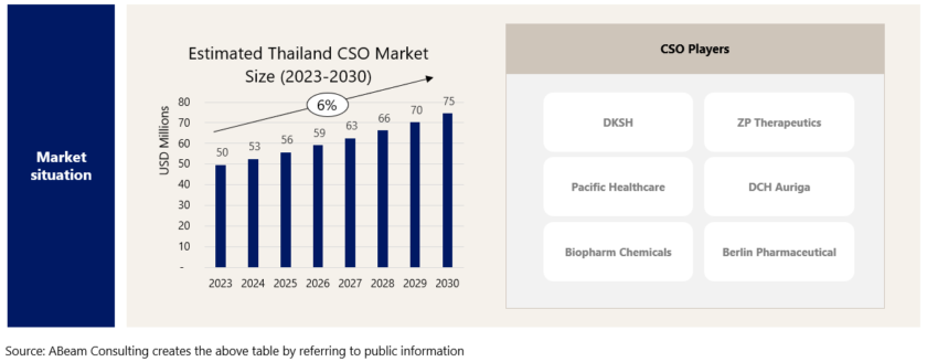 ตัวอย่างหนึ่งของกลยุทธ์การเข้าสู่ตลาดที่ได้รับความนิยมในกลุ่มบริษัทยา คือการจับมือเป็นพันธมิตรกับ บริษัทตัวแทนจำหน่ายหรือ CSO ซึ่งมีบทบาทสำคัญในการสนับสนุนงานด้านการขายและกระจายสินค้า ทำให้ CSO กลายเป็นตัวเลือกเชิงกลยุทธ์ที่น่าสนใจสำหรับบริษัทที่ต้องการเข้าสู่ตลาดไทย ที่ผ่านมามีบริษัทหลายรายที่เลือกใช้บริการของ CSO เพื่อเพิ่มประสิทธิภาพในการขายและเสริมความแข็งแกร่งในกระบวนการบริการหลังการขาย ตลาด CSO ในประเทศไทยถือเป็นตลาดที่มีความพร้อมสูงและยังมีแนวโน้มเติบโตอย่างต่อเนื่อง โดยคาดว่าจะมีอัตราการเติบโตต่อปีแบบทบต้น (Compound Annual Growth Rate: CAGR) เฉลี่ยที่ 6% ต่อปี และมีมูลค่าตลาดแตะ 75 ล้านดอลลาร์สหรัฐภายในปี 2030 [รูปที่ 7] โดยมีผู้เล่นหลักในตลาดอย่างบริษัท DKSH และ Zuellig Pharma ซึ่งครองส่วนแบ่งหลักจากความได้เปรียบด้านทีมขายมืออาชีพ เครือข่ายที่ครอบคลุม และระบบโลจิสติกส์ที่แข็งแกร่ง อย่างไรก็ตาม ตลาดยังคงเปิดกว้างสำหรับผู้เล่นท้องถิ่น เช่น Biopharm และ Berlin Pharma ที่มีความเชี่ยวชาญเฉพาะในผลิตภัณฑ์กลุ่มเฉพาะทาง (Niche Products) ซึ่งสามารถตอบโจทย์ความต้องการเฉพาะกลุ่มได้อย่างมีประสิทธิภาพ