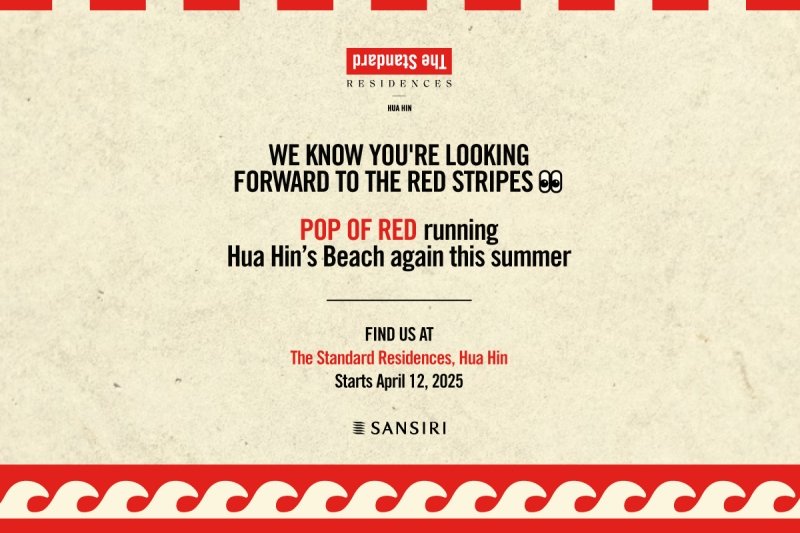 เตรียมสัมผัสกับไวบ์ “POP OF RED” ที่จะทำให้คุณได้ Check in จนไม่อยาก Check out อีกต่อไป ได้ 3 ช่วงวันหยุด Long Weekend ตลอดซัมเมอร์นี้ได้แก่ 12-16 เมษายน, 1-4 พฤษภาคมและ 10-12 พฤษภาคมนี้! ที่บริเวณชายหาดหน้าโครงการ The Standard Residences, Hua Hin ตั้งแต่เวลา 16.00-19.00 น.