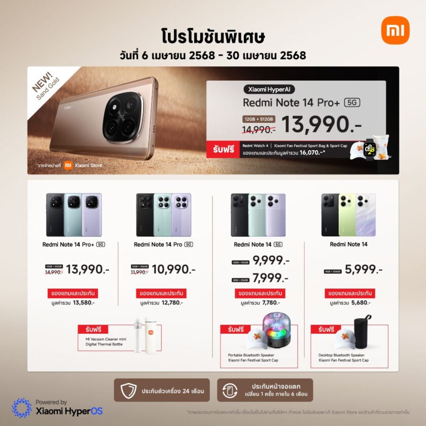 เสียวหมี่ ประเทศไทย ยังประกาศวางจำหน่ายสมาร์ทโฟน Redmi Note 14 Pro+ 5G สีใหม่ล่าสุด คือ สี Sand Gold อย่างเป็นทางการในประเทศไทย โดยวางจำหน่ายรุ่นความจุ 12GB+512GB ในราคาพิเศษ 13,990 บาท* (จากราคาปกติ 14,990 บาท) ทั้งยังมอบของสมนาคุณ ฟรี! Redmi Watch 4 และ Xiaomi Fan Festival Sport Bag & Sport Cap พร้อมประกัน รวมมูลค่า 16,070 บาท* เฉพาะที่ Xiaomi Store ในระหว่างวันที่ 6 เมษายน ถึง 30 เมษายน 2568 เท่านั้น