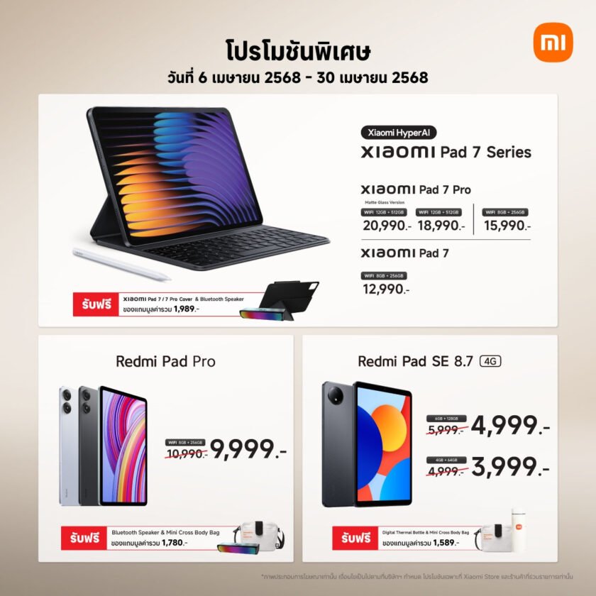 - ลูกค้าที่ซื้อแท็บเล็ต Xiaomi Pad 7 Pro หรือ Xiaomi Pad 7 รับฟรี! Xiaomi Pad 7 / 7 Pro Cover และ Bluetooth Speaker รวมมูลค่า 1,989 บาท*