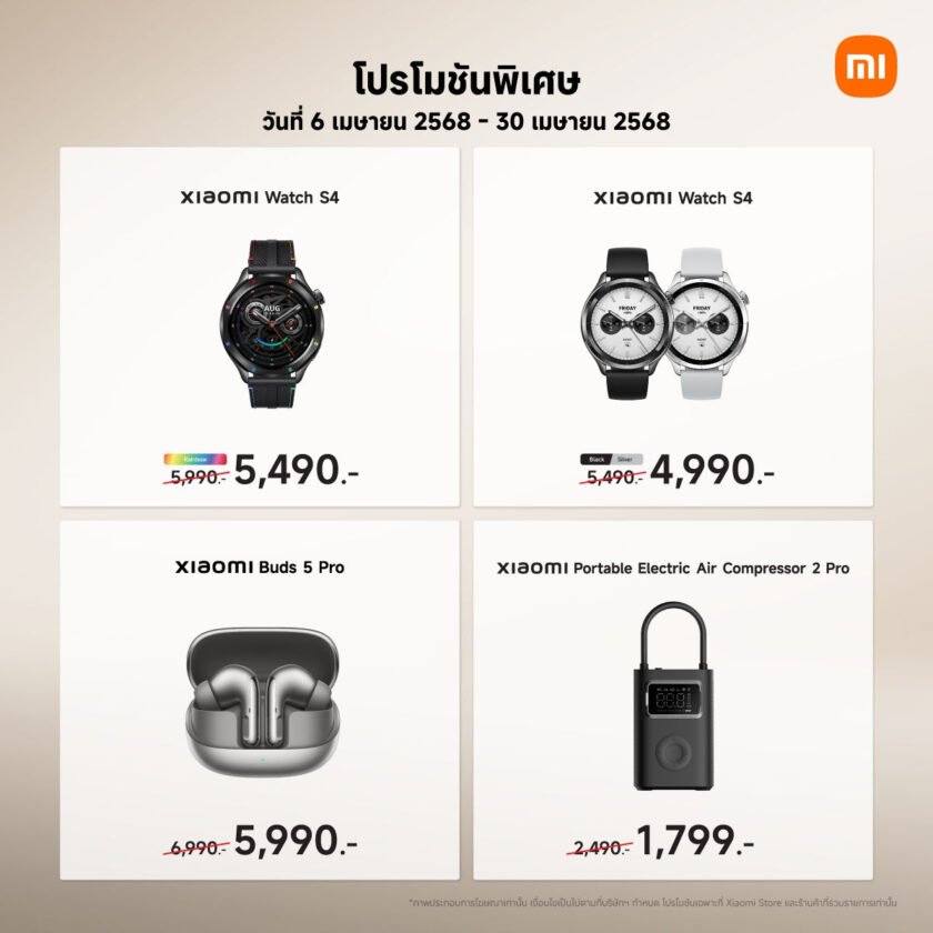 - ผลิตภัณฑ์ AIoT มากมาย อาทิ นาฬิกาอัจฉริยะ Xiaomi Watch S4 จัดราคาพิเศษเริ่มต้นเพียง 4,990 บาท* (จากราคาปกติ 5,490 บาท), หูฟัง Xiaomi Buds 5 Pro จัดราคาพิเศษ 5,990 บาท* (จากราคาปกติ 6,990 บาท) เป็นต้น