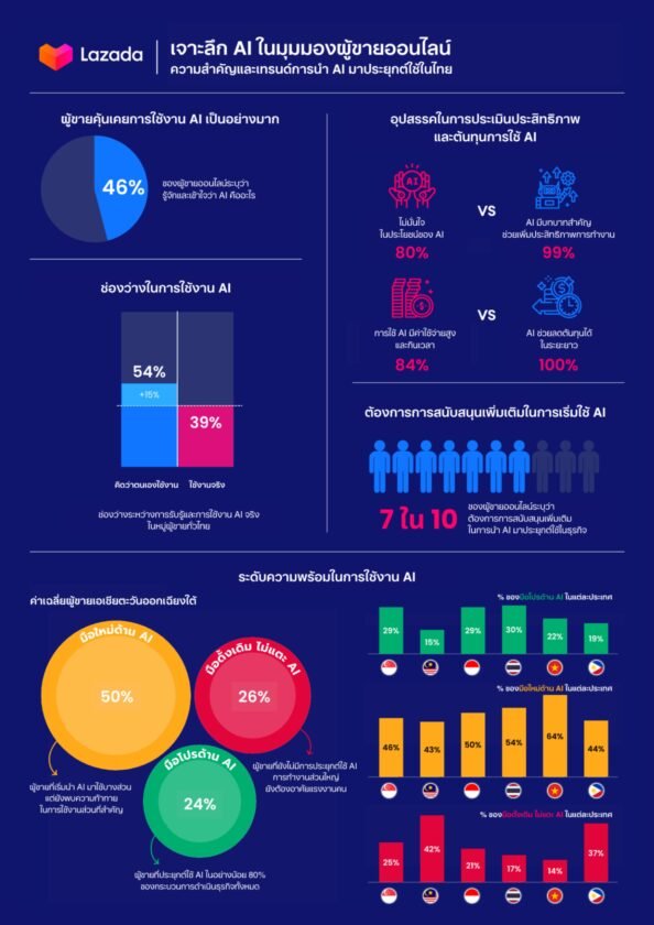 กรุงเทพฯ, 9 เมษายน 2568 – ลาซาด้า ผู้นำแพลตฟอร์มอีคอมเมิร์ซในเอเชียตะวันออกเฉียงใต้ เผยแพร่รายงานเกี่ยวกับผู้ขายออนไลน์ในหัวข้อ “โอกาสจาก AI: เปิดมุมมองและเทรนด์การใช้งาน AI ของผู้ขายออนไลน์ในเอเชียตะวันออกเฉียงใต้ (Bridging the AI Gap: Online Seller Perceptions and Adoption Trends in SEA)” ซึ่งจัดทำร่วมกับกันตาร์ (Kantar) เพื่อสำรวจความคิดเห็นของผู้ขายบนแพลตฟอร์มอีคอมเมิร์ซจำนวน 1,214 ราย ในอินโดนีเซีย มาเลเซีย ฟิลิปปินส์ สิงคโปร์ ไทย และเวียดนาม เพื่อศึกษาแนวโน้มการใช้งานเทคโนโลยี AI รวมถึงความท้าทายและโอกาสต่าง ๆ ที่สะท้อนให้เห็นความพร้อมของผู้ขายในการนำ AI มาใช้ในการดำเนินธุรกิจ โดยรายงานเผยว่า 1 ใน 4 ของผู้ขายทั่วภูมิภาคมีความเชี่ยวชาญในการใช้งาน AI ในธุรกิจ ในขณะที่ 3 ใน 4 ของผู้ขายยังต้องการการสนับสนุนในการใช้ AI ให้เกิดประสิทธิภาพสูงสุด