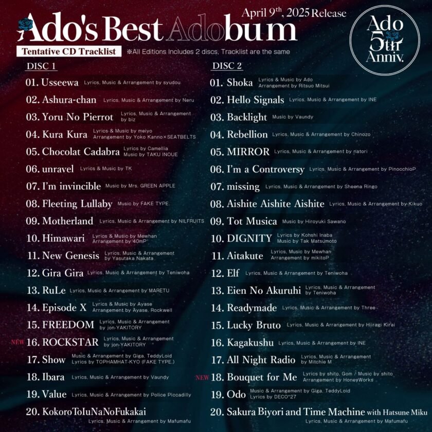 หลังจากปฏิวัติวงการเพลงญี่ปุ่นอย่างยิ่งใหญ่ด้วยการเดบิวต์เป็นศิลปินแนว J-Rock กับค่ายเพลงใหญ่อย่าง Virgin Music ในเครือ Universal Music Japan เมื่อ 5 ปีก่อนด้วยเพลง “Usseewa” วันนี้ Ado ศิลปินสาวชาวญี่ปุ่นวัย 22 ปีที่มาพร้อมน้ำเสียงทรงพลังสะกดใจแฟนๆ ตั้งแต่ครั้งแรกที่ได้ยิน ปล่อยอัลบั้มรวมเพลงฮิตครั้งแรกที่มีชื่อว่า Ado’s Best Adobum ออกมาเป็นที่เรียบร้อยแล้ว อัดแน่นเพลงฮิตที่แฟนๆ ของ Ado รักกว่า 40 เพลง