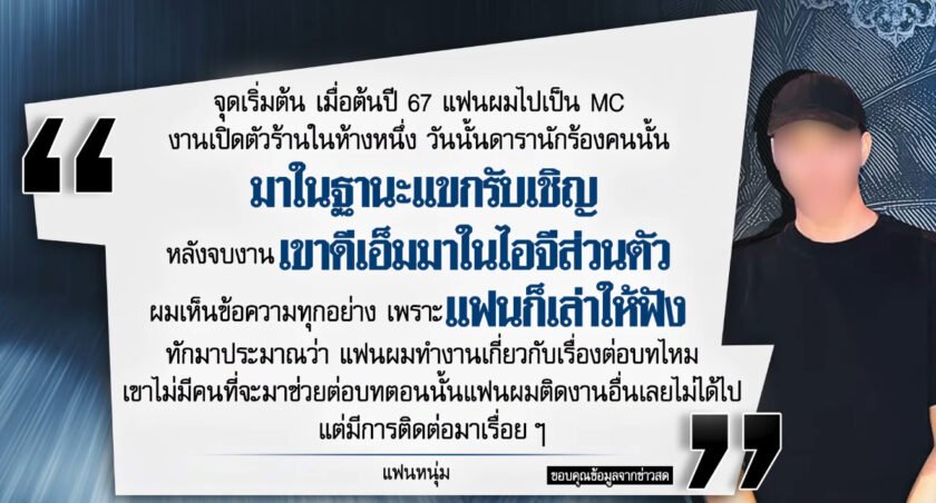 โดยในรายการ พุทธ อภิวรรณ กล่าวว่า “หลังจากเพจอีซ้อ ลงเรื่องราว แต่ไม่ได้บอกว่าใครอะไรอย่างไร เพียงแต่บอกว่า เรื่องราวทั้งหมดมีผู้ชายคนหนึ่งมาร้องเรียนขอความเป็นธรรม เนื่องจากแฟนสาวของเขาไปรู้จักกับนักร้องคนนี้ แล้วเขาก็สงสัยว่าแฟนไปส่งนักร้องคนนี้ ออกไปพร้อมทีมงาน แต่กลับมาช้า จังหวะที่กลับมาช้านั้น เขาก็เลยเปิดไอโฟนเพื่อดูว่าแฟนสาวเขาอยู่ไหน จนพบว่าพิกัดแฟนสาวอยู่คอนโด จึงรีบตามไป จังหวะที่ไปคอนโดก็พบว่า นักร้องชายคนนี้ลงมาพร้อมกับแฟนสาวของเขา และใช้เวลาอยู่ในคอนโดกว่า 3 ชม.