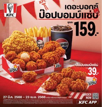 พบควันหลงความอร่อยโค้งสุดท้ายกับ ป๊อป บอมบ์ แซ่บ ได้ที่ KFC ทุกสาขา ถึง 23 เมษายน นี้ (หรือจนกว่าสินค้าจะหมด!) เท่านั้น ชุด เดอะบอกซ์ ป๊อปบอมบ์แซ่บ ราคาเพียง 159 บาท และชุด ดับเบิลบักเก็ต ป๊อปบอมบ์แซ่บ ราคา 399 บาท ติดตามข่าวสารกิจกรรมสุดพิเศษอื่นๆ ของ KFC Thailand ได้ที่ TikTok @kfcthailand, Instagram @kfcthailand, Facebook KFC Thailand และ X @KFCThailand